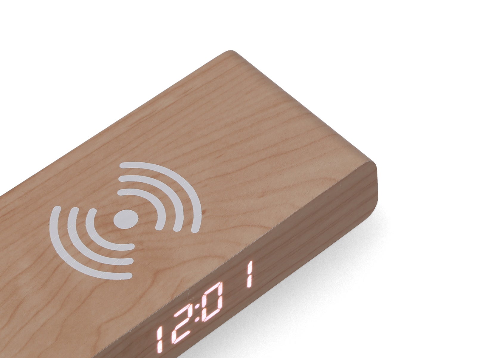The simple and modern design of this rectangular object resembles a block of light wood. Unlike any ordinary log, this one includes precise technology that sets it apart and makes it special. It highlights the time on an ingeniously integrated digital display, with its red numbers shining against the light, smooth wood, adorning it with a touch of intense color.