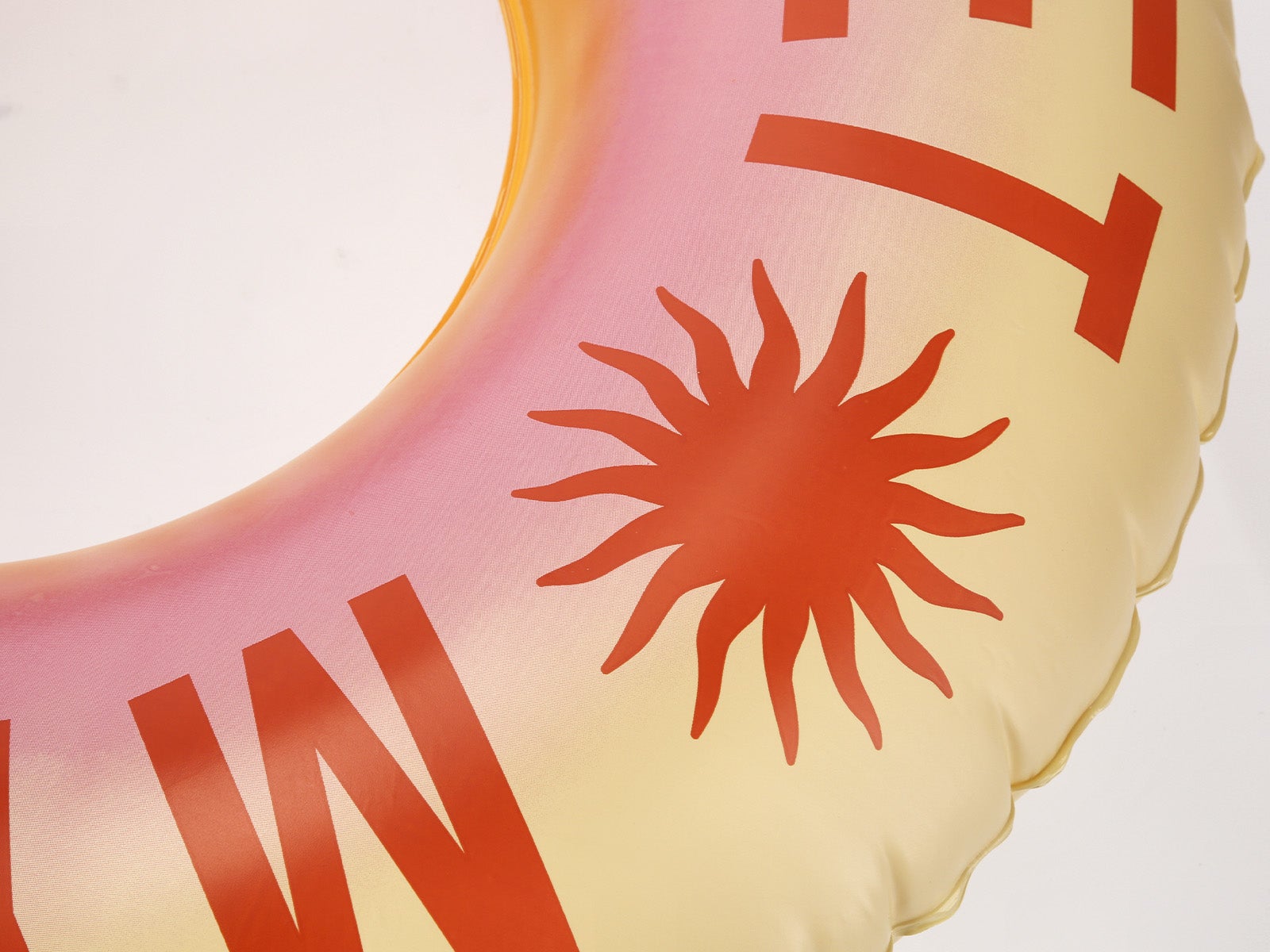 Relax in style! ALE-HOP's Donut Swim Ring - Sunset stands out with its beautiful gradient design and inspiring quote. Durable, comfortable, and perfect for shining under the sun this summer.