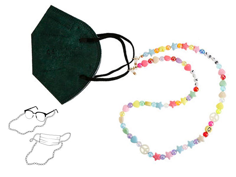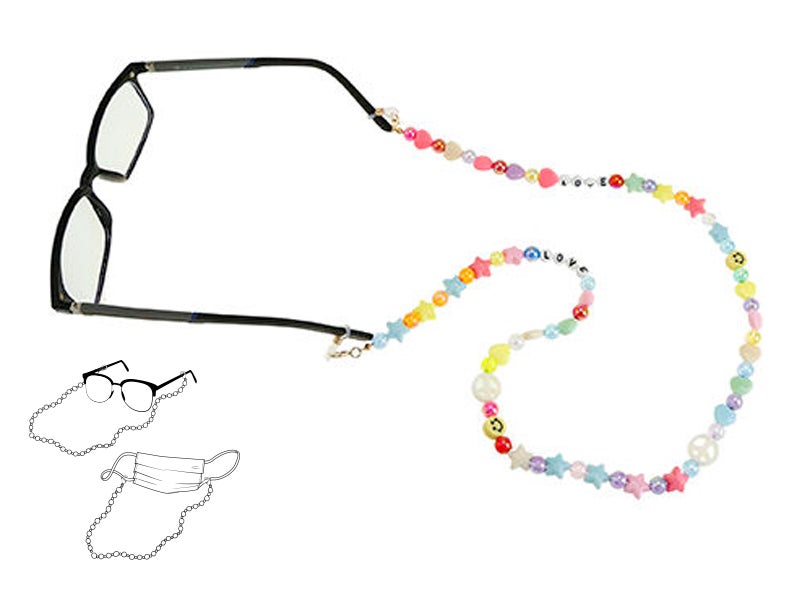 Design: multicolored stone and bead cord with different shaped stars, smiley faces, or letters. With adjustable silicone adapters at the ends to fit them to the arms of your glasses.