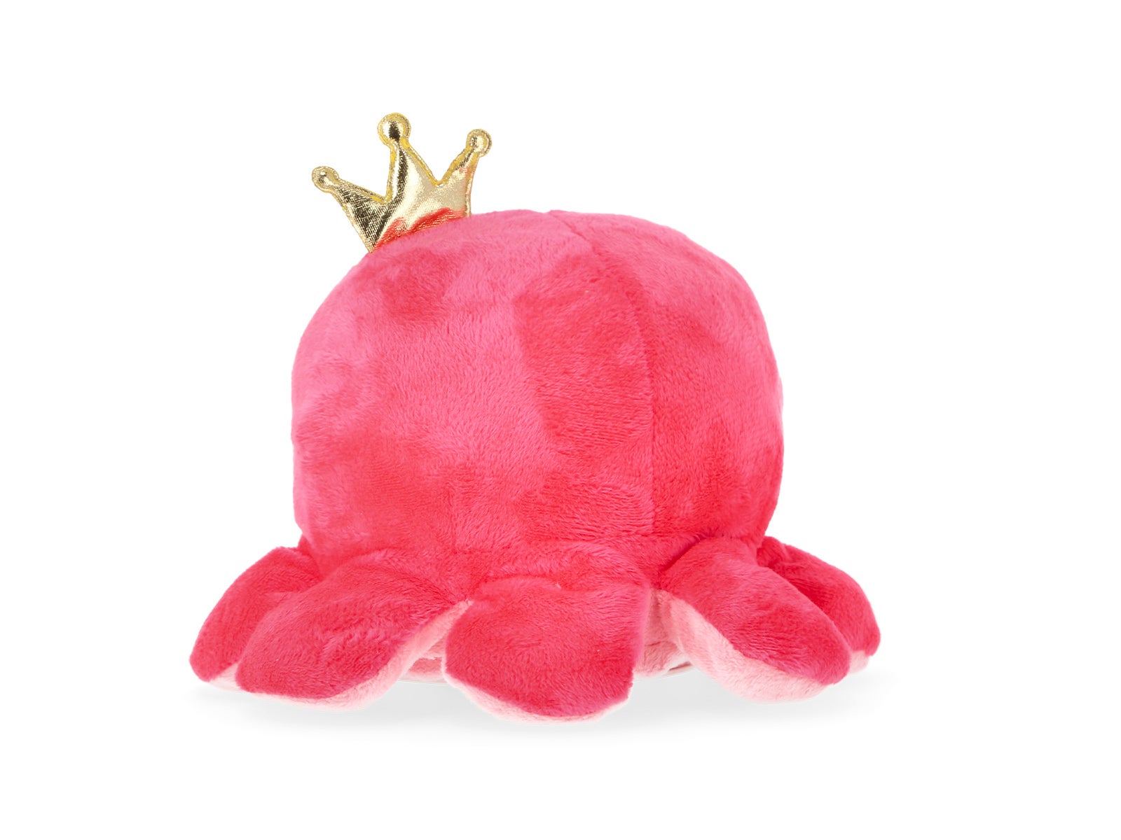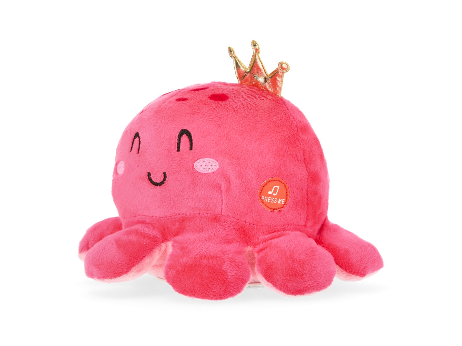 Interactive pink octopus plush with golden headband, high-quality velvety texture, and surprise melody when pressed. Ideal for stylish sea fans.