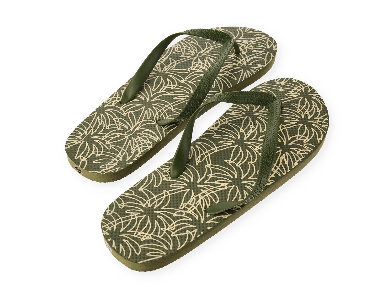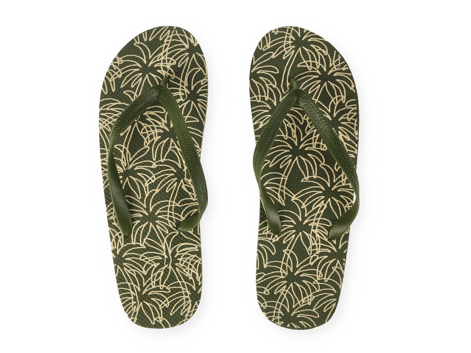 Get ready for the beach or pool with these ALE-HOP flip-flops. Featuring a timeless olive green design and an elegant light-toned palm tree print, these flip-flops are the definition of a worry-free summer. Their organic aesthetic pairs perfectly with your favorite swimwear or a casual look for sun-drenched strolls.