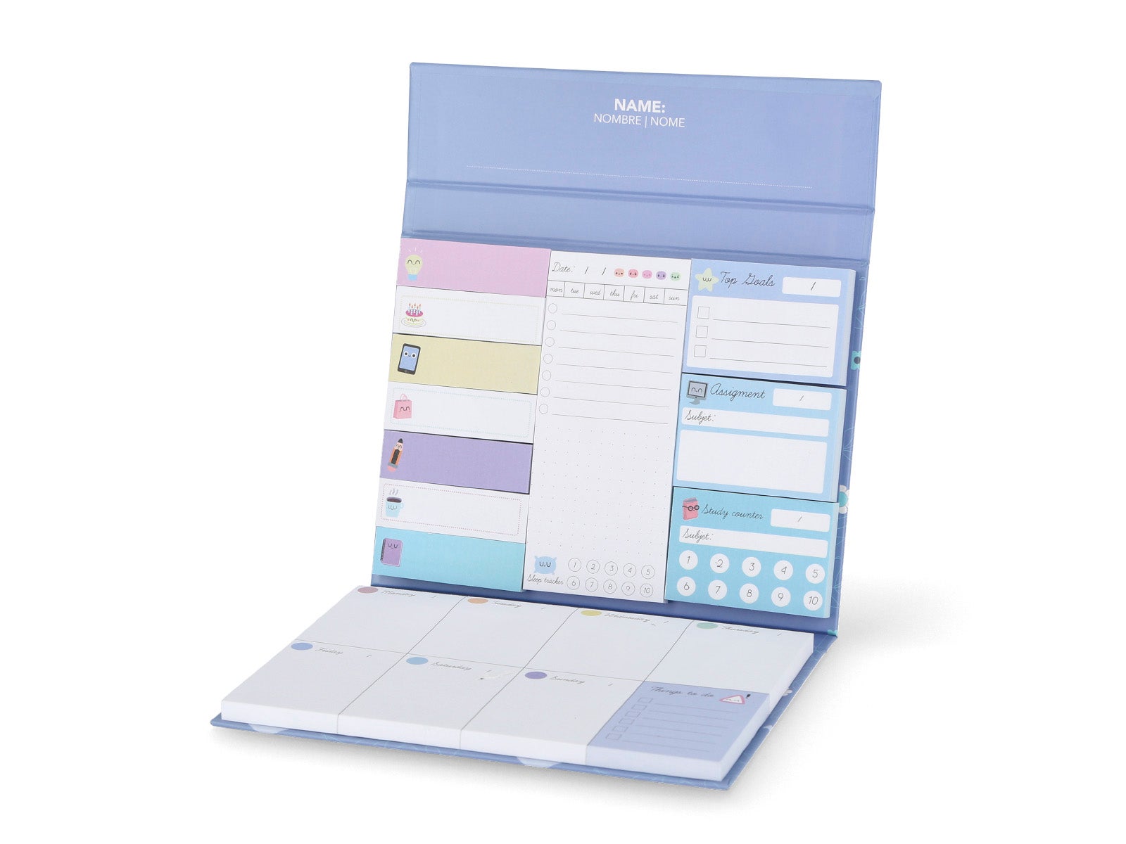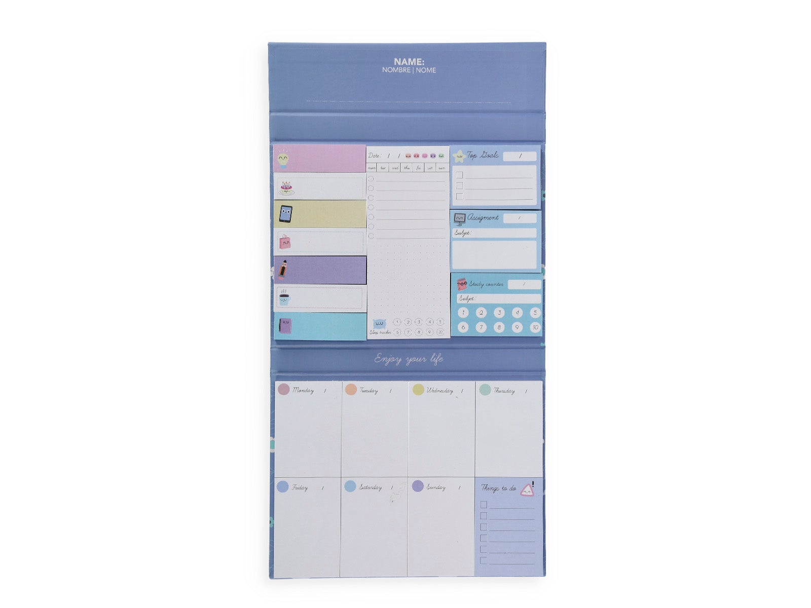 Are you looking for a weekly organizer with sticky notes that can be used as notes, reminders, or labels? Yes, here it is, the mystical planner with sticky notes, it's amazing! For stationary and organization lovers, this will become your favorite notebook-organizer. Its versatility will enchant you, as well as its design. Design: organizer in the form of a notebook, with sticky notes on the left side for: - Small free notes with icons. - Notes to mark the day of the week, in large size, with a mood icon, half horizontally ruled paper half dotted and a sleep indicator. - 'Do not forget' notes to jot down your appointments and events. - 'Assignment' notes, to assign a specific task of a subject on a date. - Notes with a monthly calendar to organize the entire month and notes with grid ruled lines. And on the right side it has an organizer where you can write the date by week, with space to write your tasks for each day of the week. Exterior: blue with various flower, sun, and moon drawings, text on the cover 'love.' Closure: magnetic flap, to securely store your to-dos. Super convenient format. Hardcover. Size: A5. Use: it is the weekly planner to put your life in order, daily tasks for studying or work, goals or objectives, essential notes... all at a glance on the same page. Week after week, you remove... the most convenient in years, it's amazing! It's great to have on your desk and write down tasks, so you'll know what awaits you that week, what you must not forget, and what your proposed objectives are, so now you only have one thing left... go get them! Set: don't miss the weekly planner and sticky notes with a cover. Choose the one you like the most.