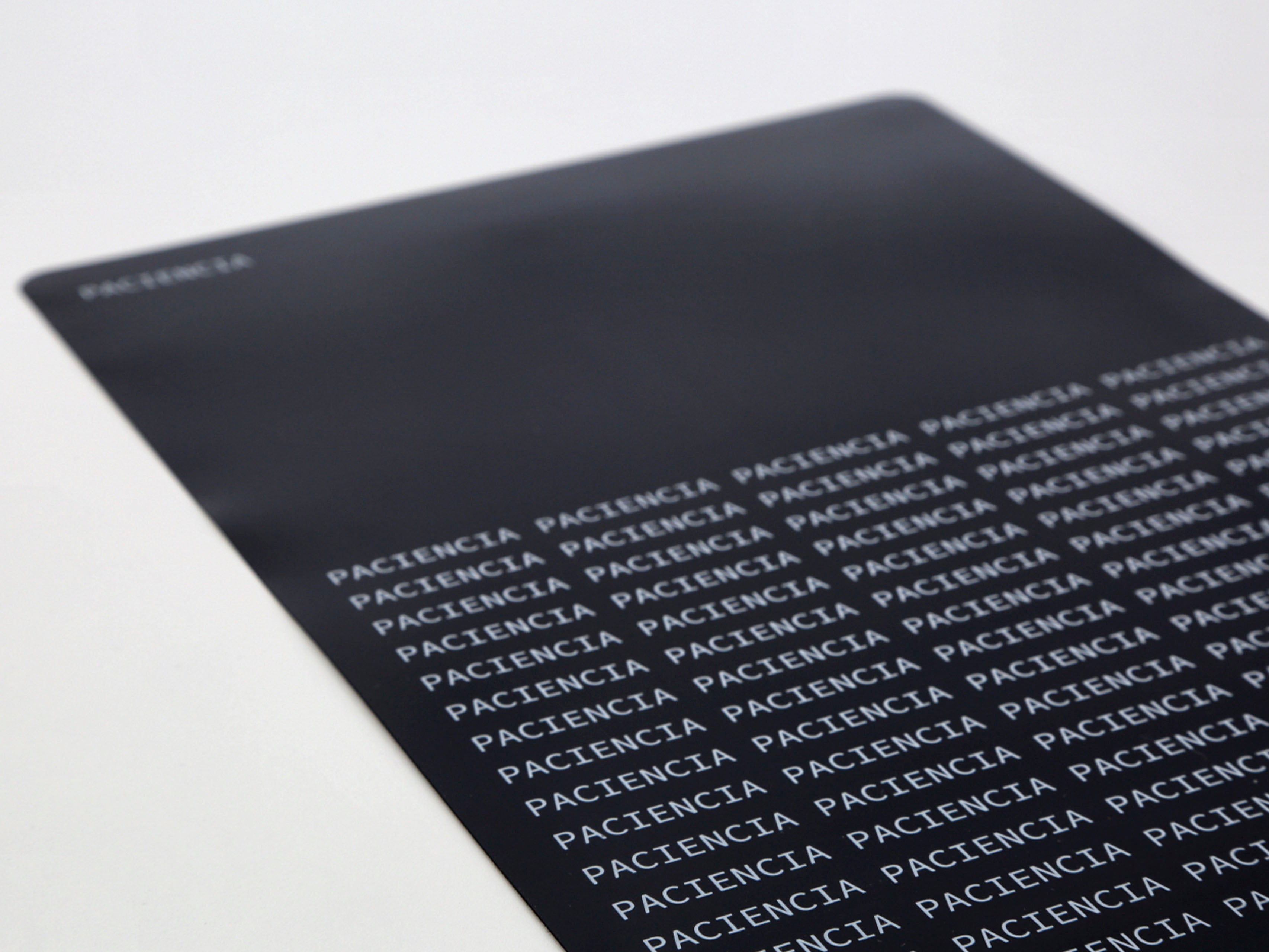 Its background is predominantly black, and the text "PATIENCE," repeated in a constant pattern, stands out in white forming a uniform and modern graphic design that will not go unnoticed.