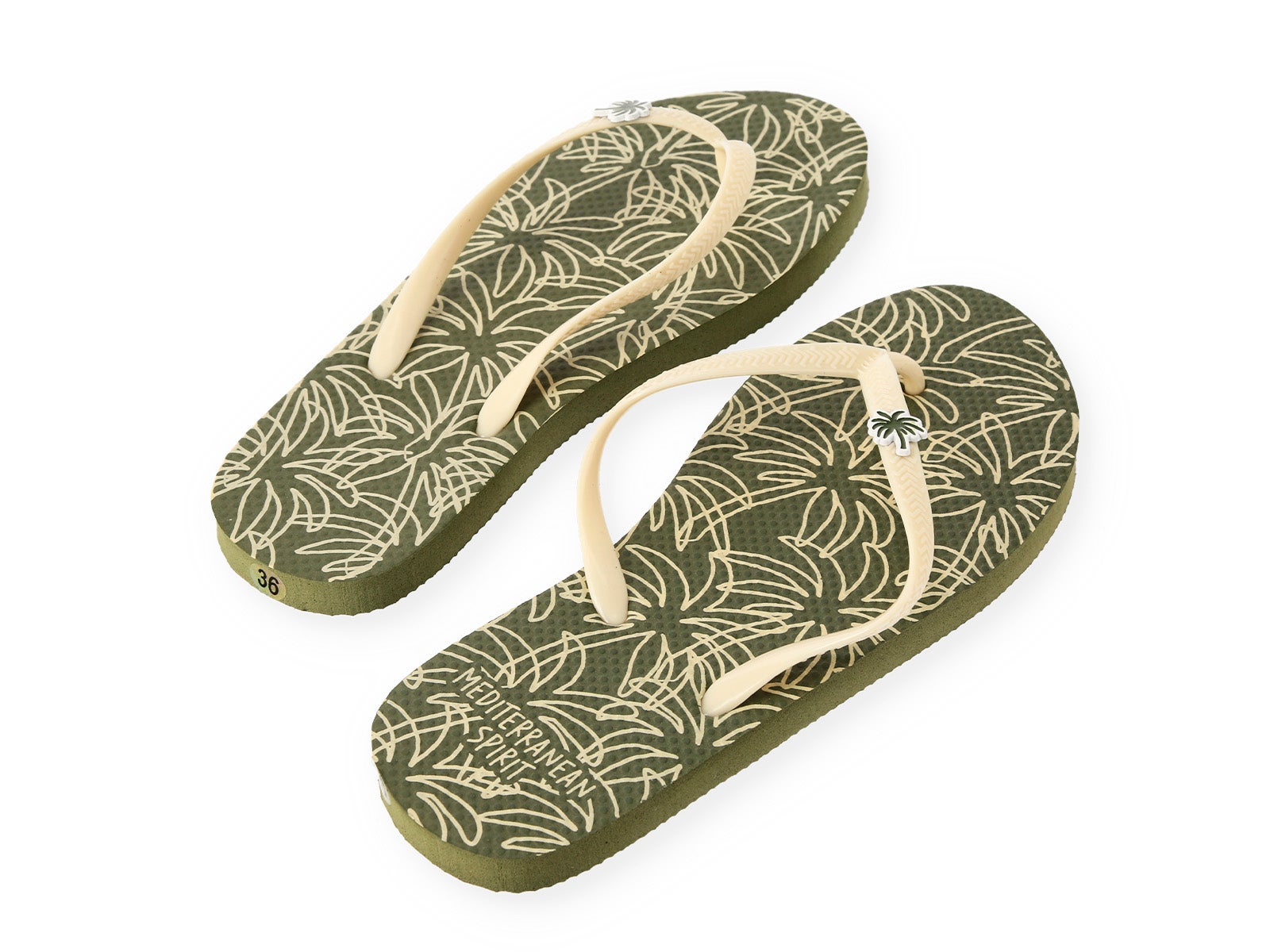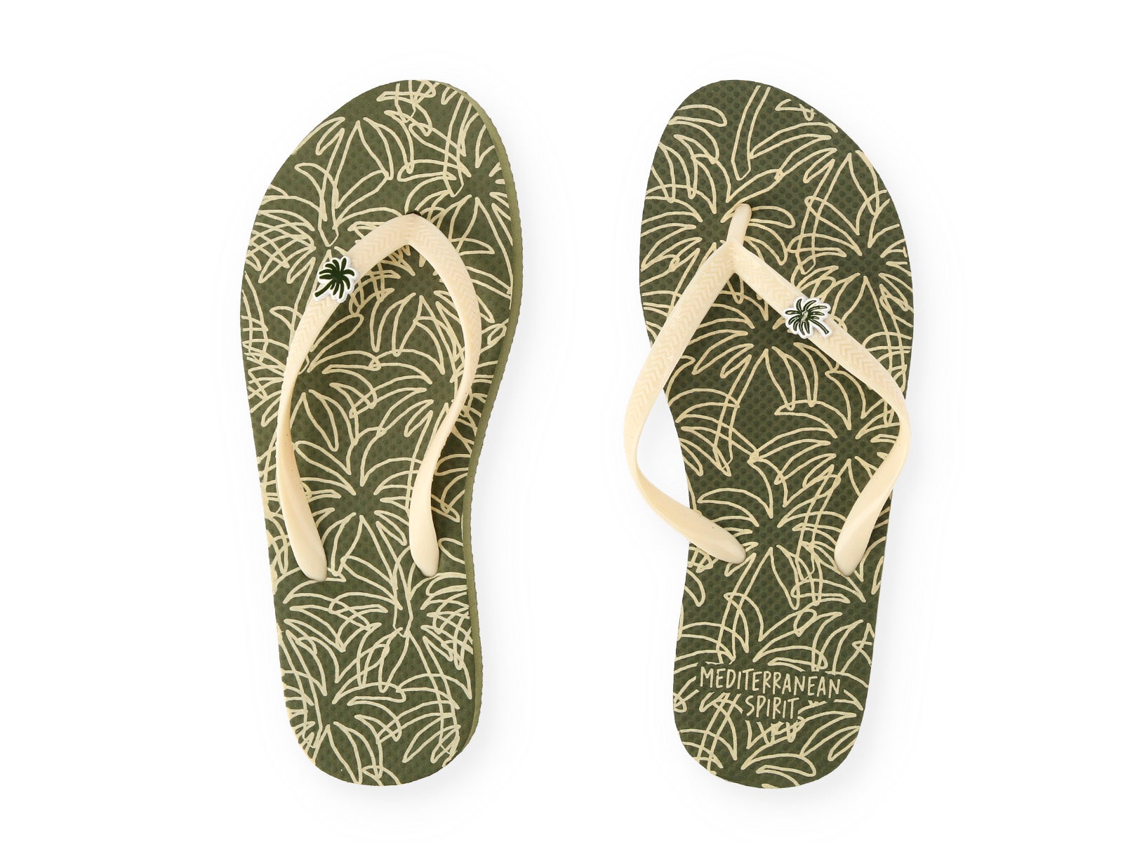 Get ready to enjoy the sun with ALE-HOP's Flip-Flops. Featuring an elegant design in olive green and cream tones, these flip-flops capture the essence of the coast with their palm tree print. They are the ideal accessory for your beach getaways, poolside afternoons, or simply a relaxed stroll under the sun.