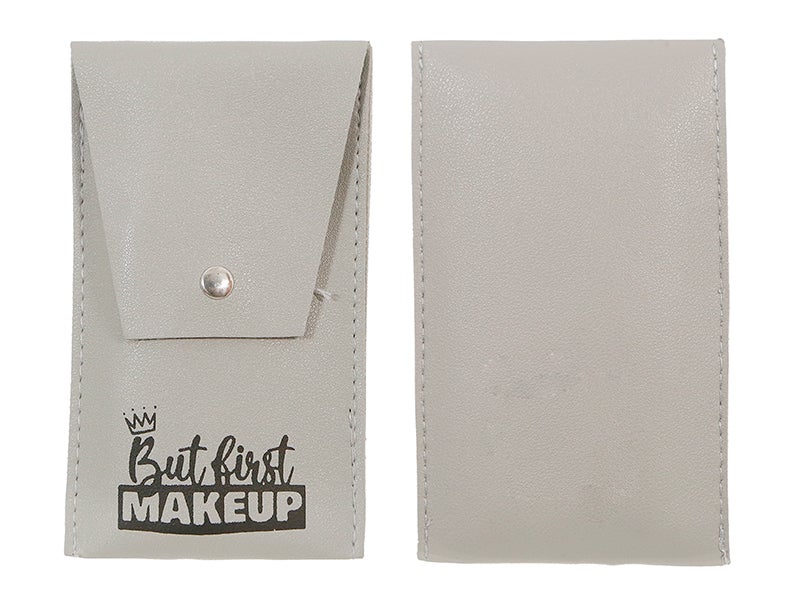 Design: White brushes with an old gold finish and cream hair. Beige pouch with the phrase 'but first makeup'.
