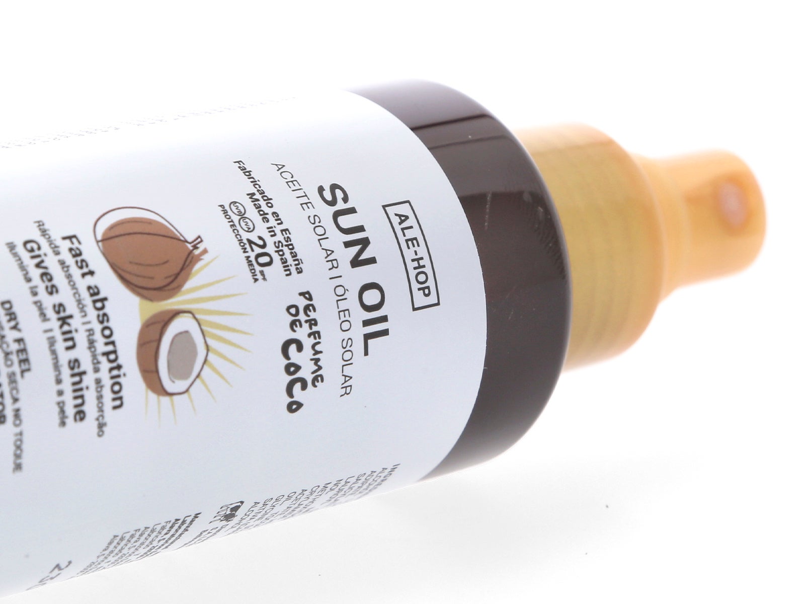 Sunscreen oil spray SPF 20 eco-chic style, with coconut scent, glossy finish, and dry touch. Protect your skin and enjoy the sun with a touch of luxury. Available at ALE-HOP.