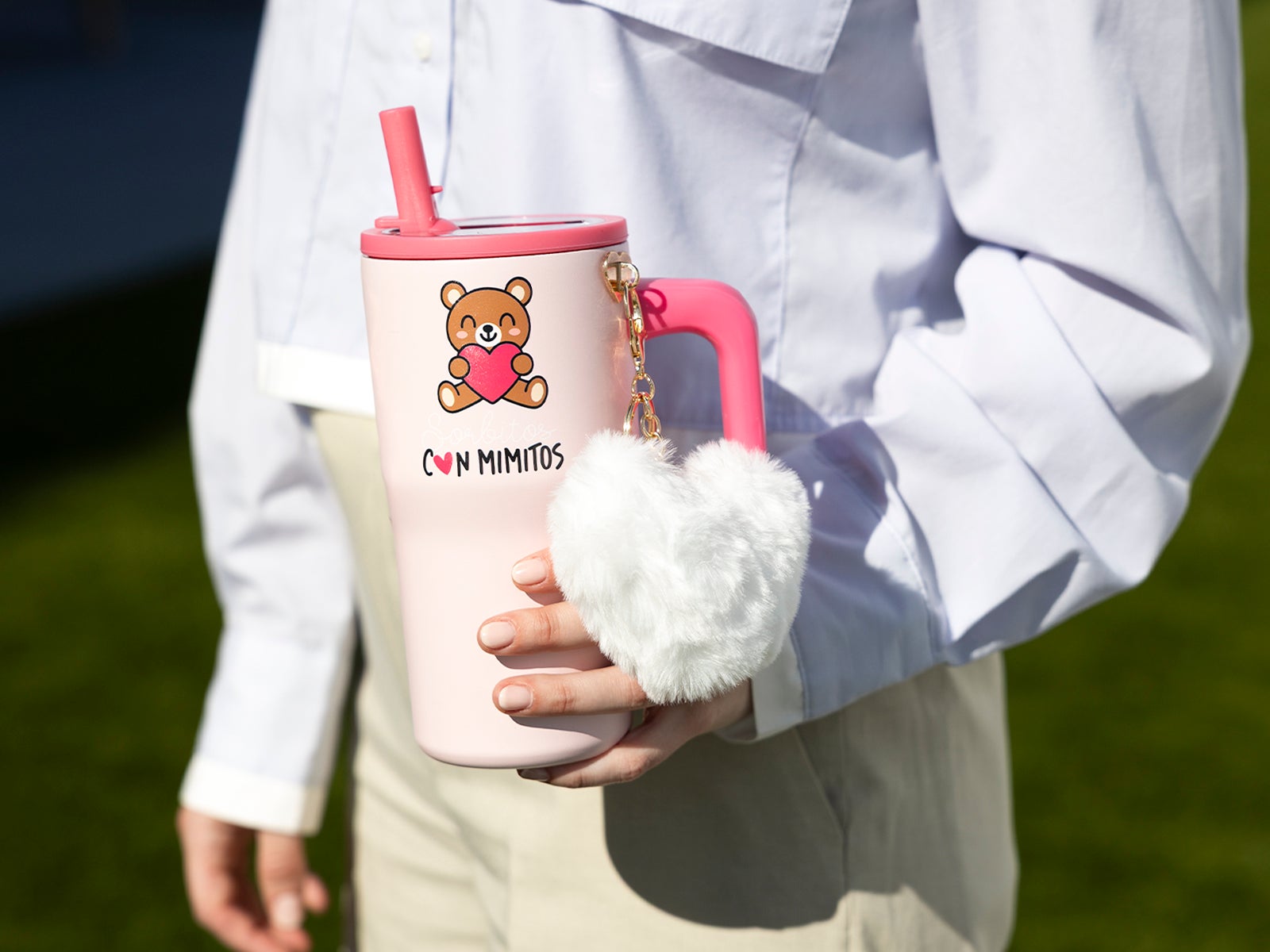 Personaliza tu taza con el Accesorio de corazón para botella de ALE-HOP. Un tierno colgante de peluche con forma de corazón y cadena metálica para darle un toque dulce y único a tu hidratación. ¡Imposible no quererlo!