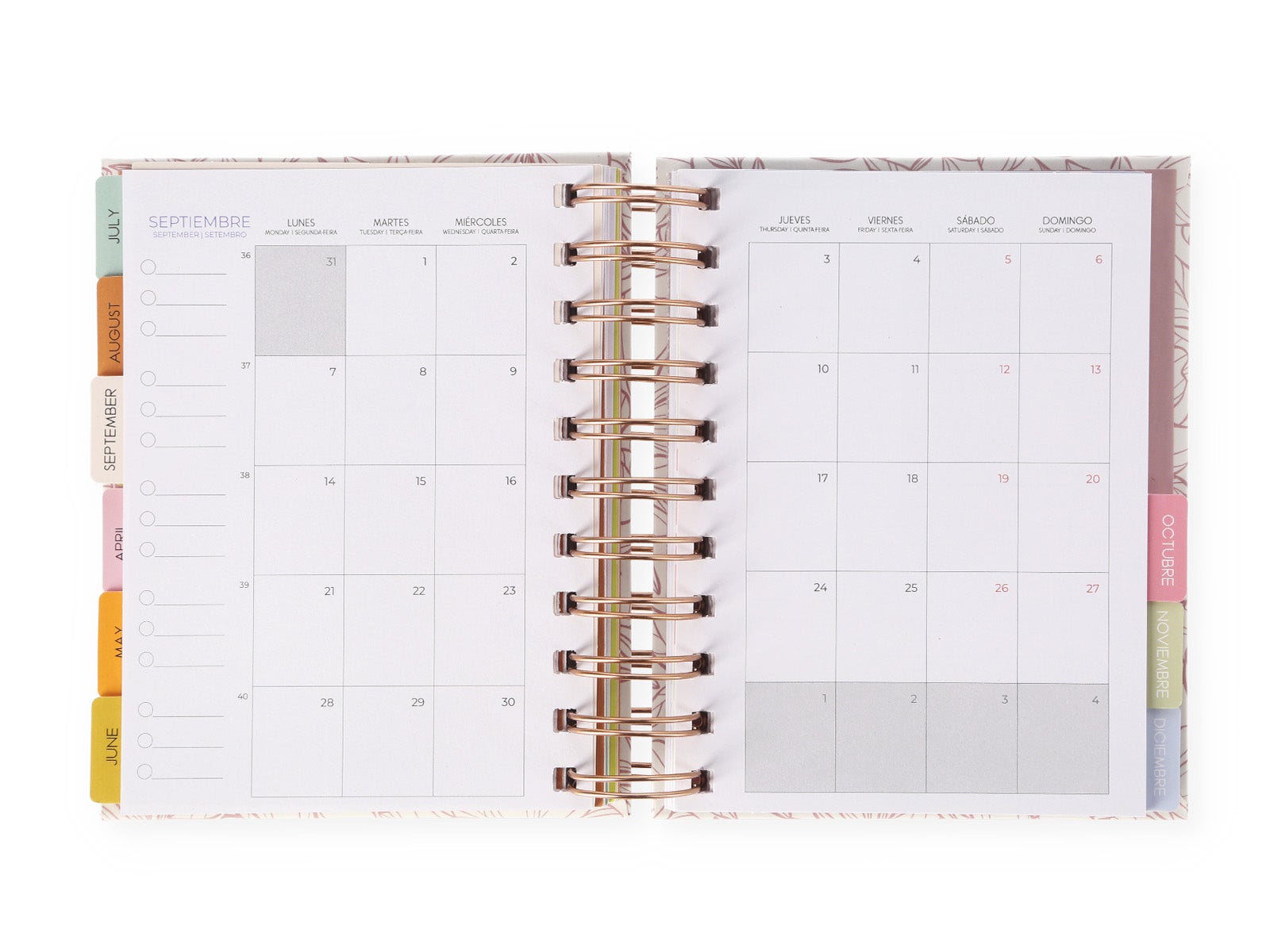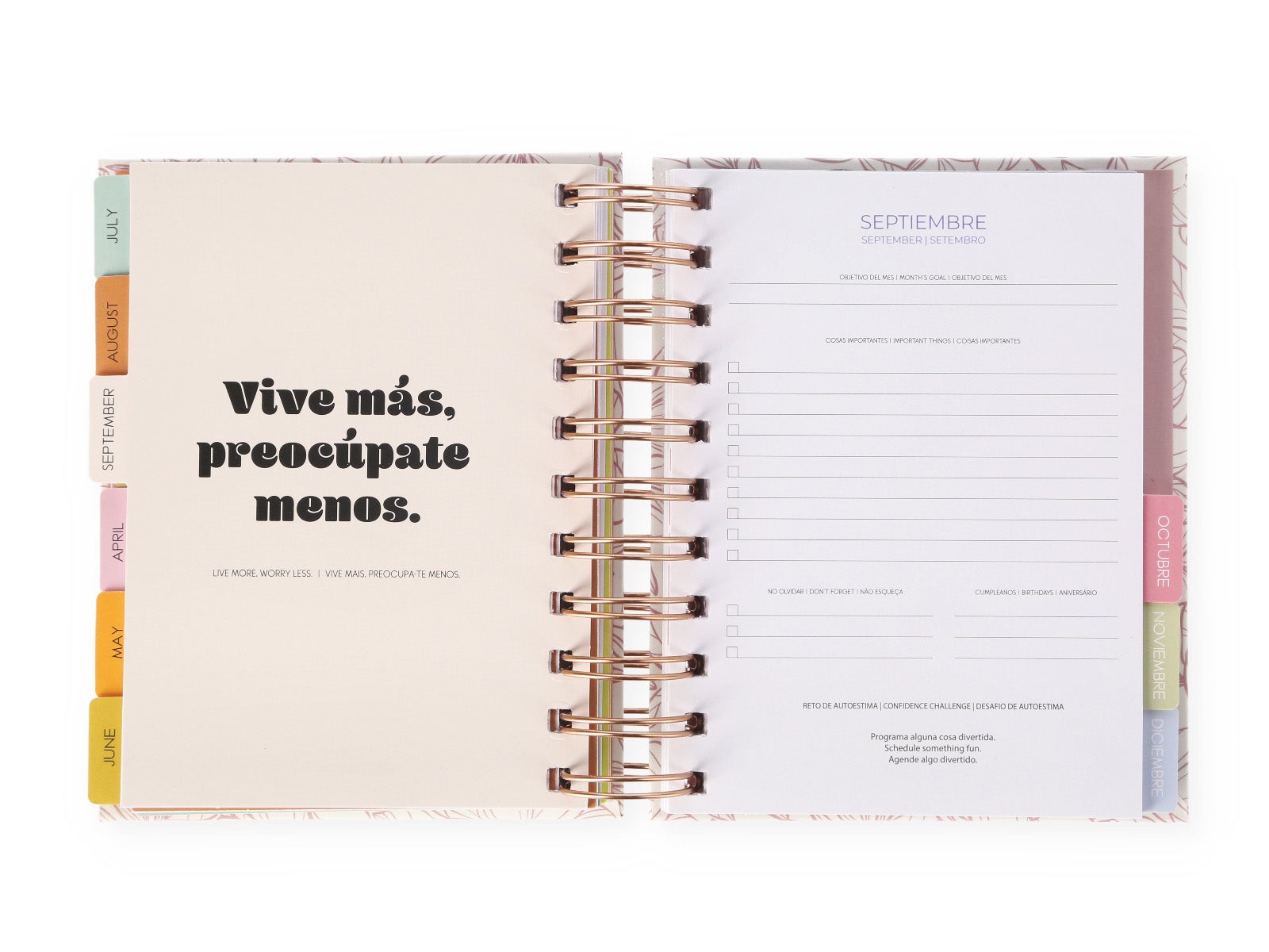 - Organización total: Incluye hojas para planificar tus días, tomar notas espontáneas y mucho más.