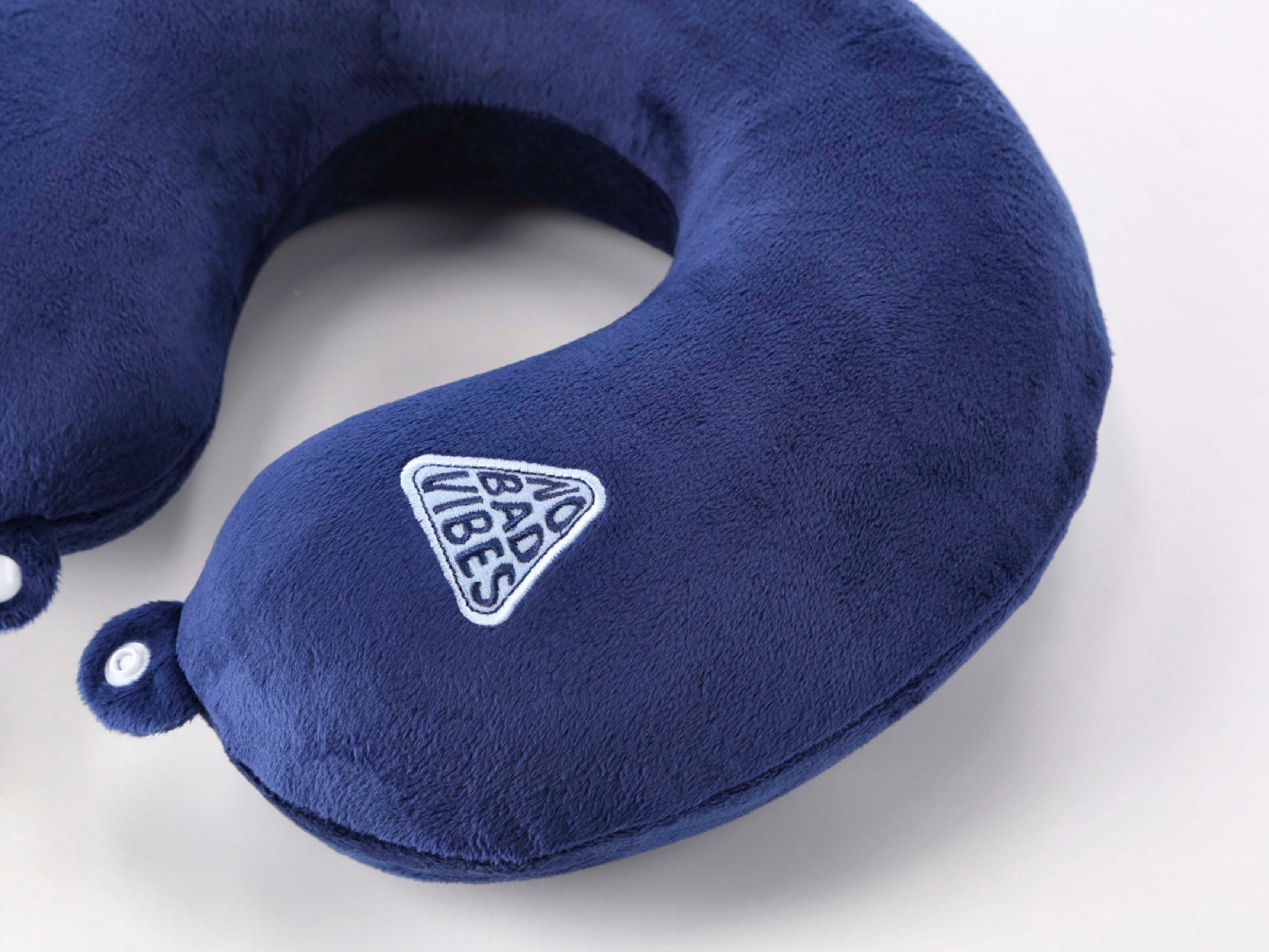 La Almohada de Viaje azul de ALE-HOP es el acompañante perfecto para tus viajes. Su diseño ergonómico, suave textura y mensaje inspirador, "NO BAD VIBES", te garantizará un descanso placentero. Incluye clip de sujeción para fácil transporte.