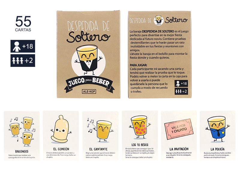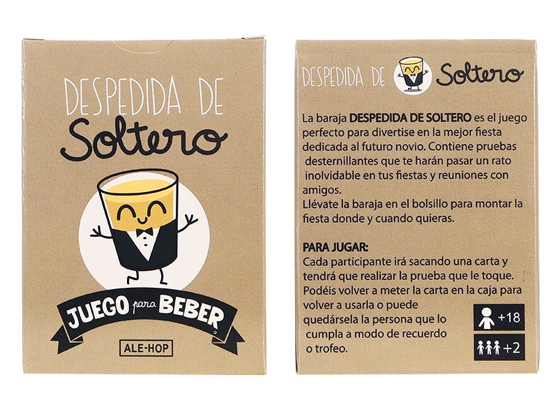 La baraja cartas beber y fiesta soltero es el juego perfecto para divertirse en la mejor fiesta dedicada al futuro novio. Contiene pruebas desternillantes que te harán pasar un rato inolvidable en tus fiestas. ¿Lo mejor? Puedes llevártela en el bolsillo para montar la fiesta donde y cuando quieras, ¡que el ánimo no decaiga!