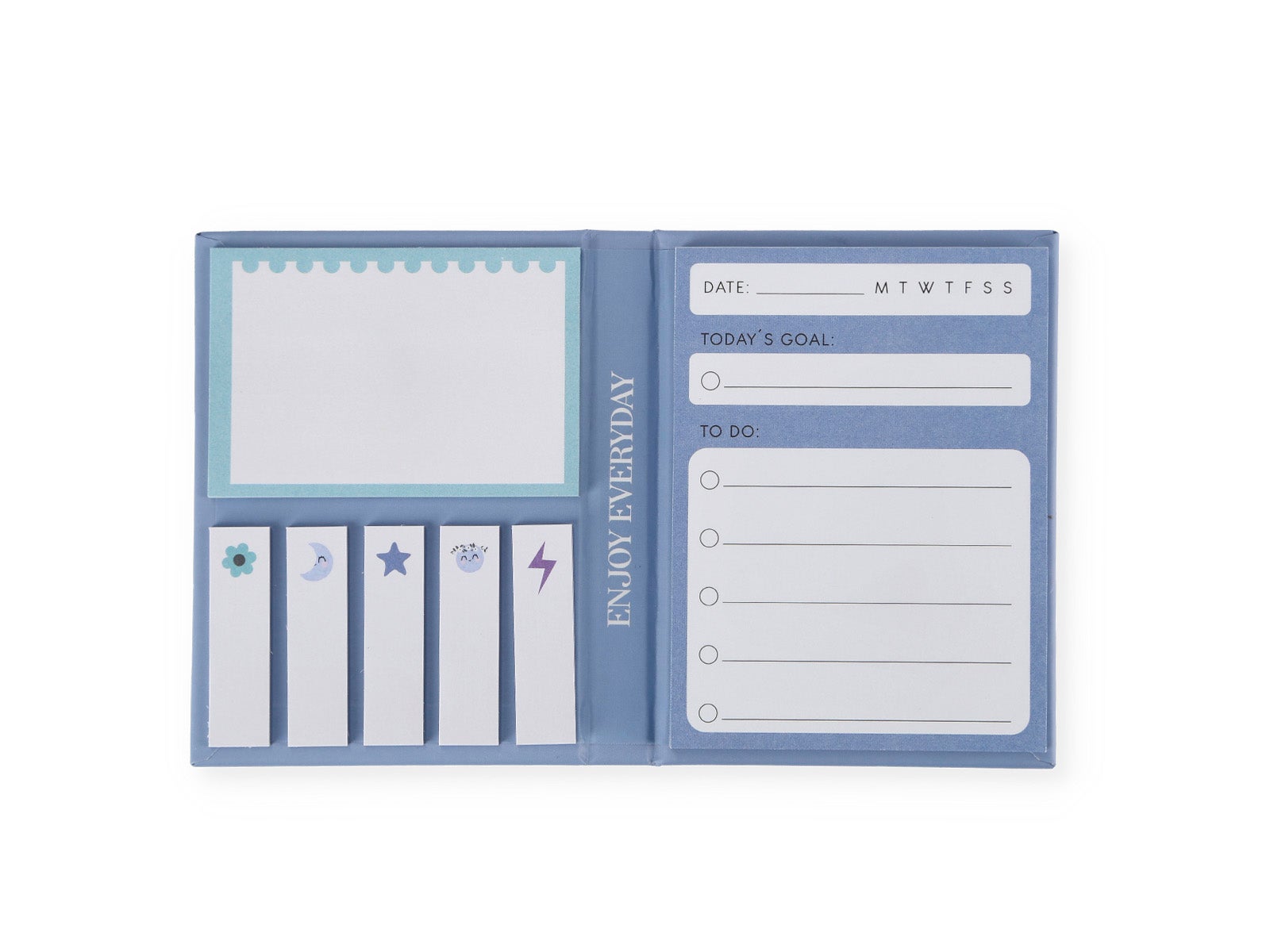 - 5 bloques de posits pequeños con iconos: flor, luna, estrella, luna y rayo.