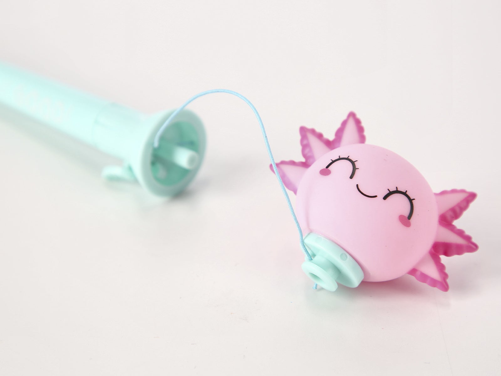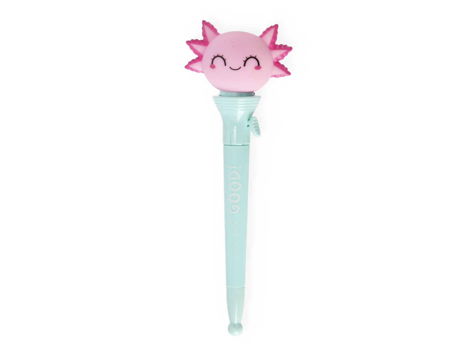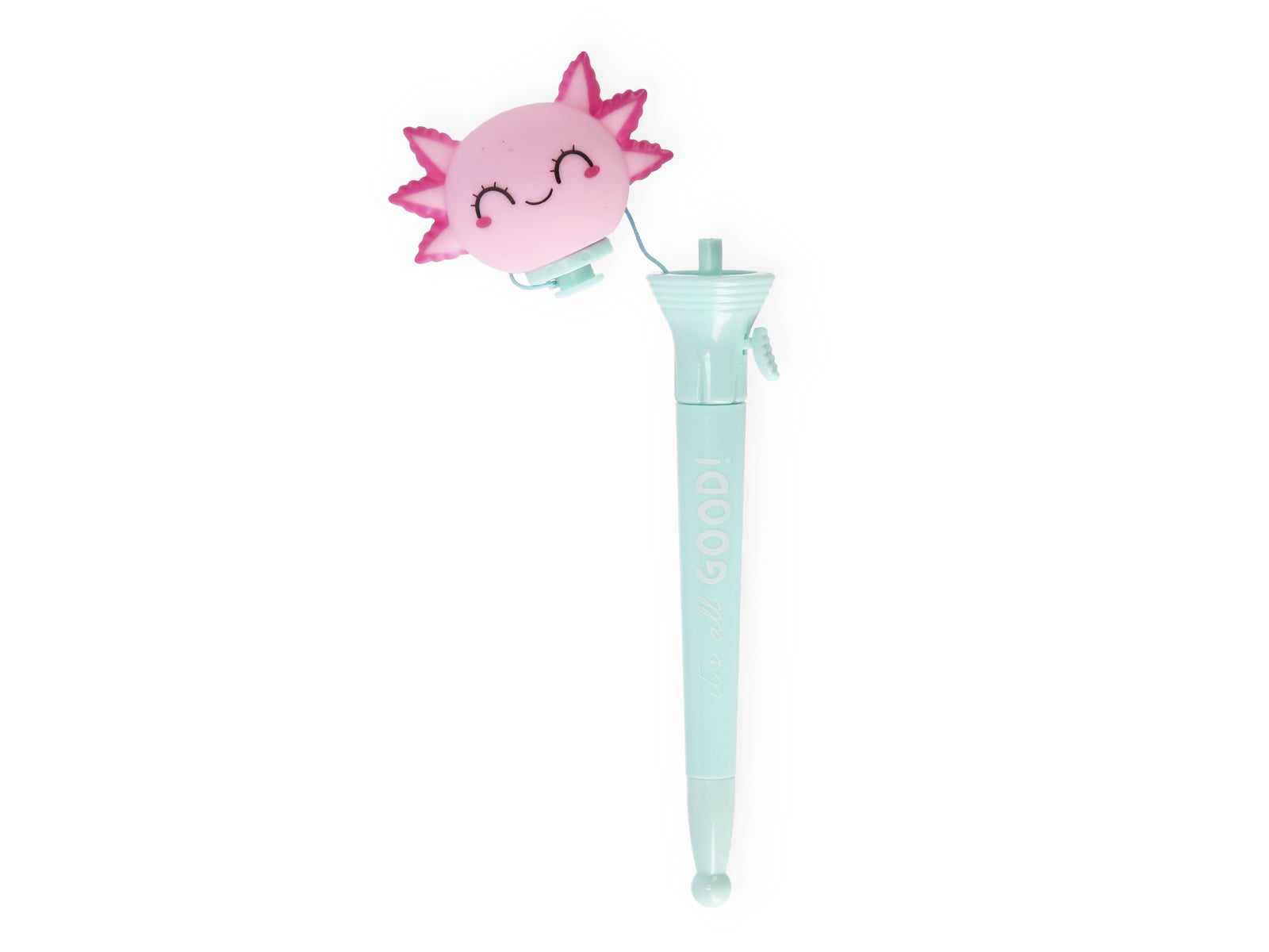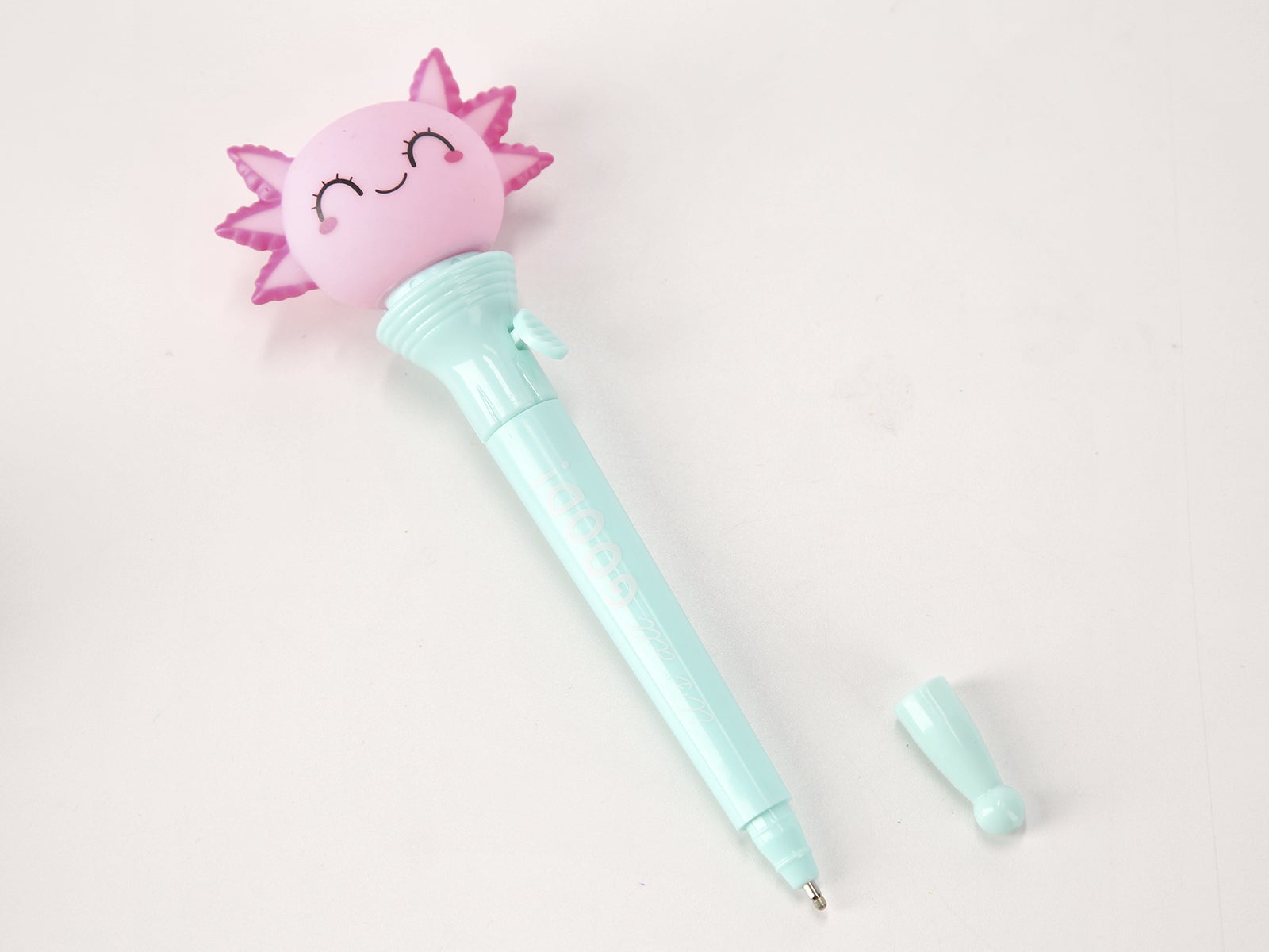 - Diseño divertido: Un bolígrafo lleno de color con un ajolote juguetón que salta al activarlo. ¡Nunca el escribir fue tan entretenido!