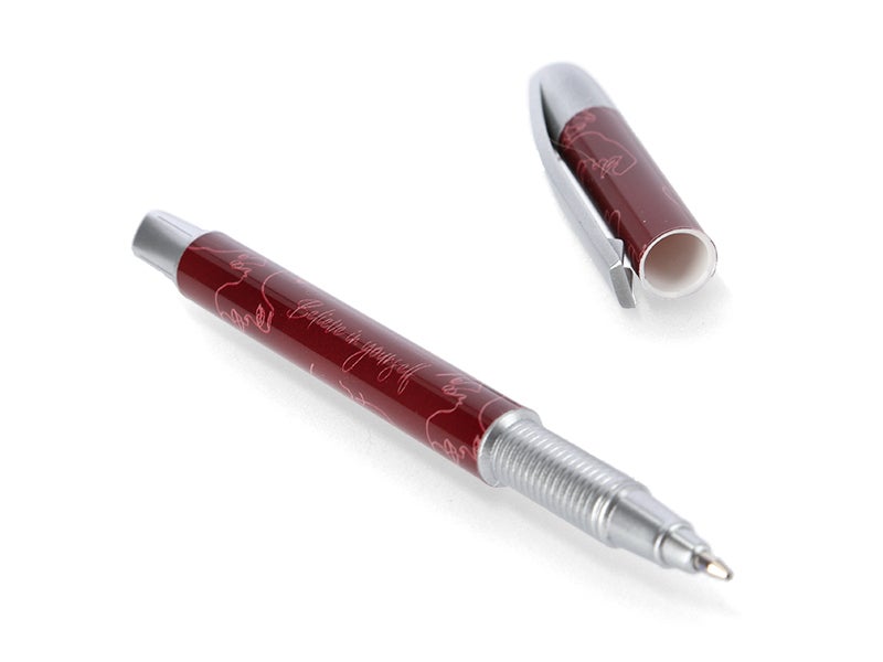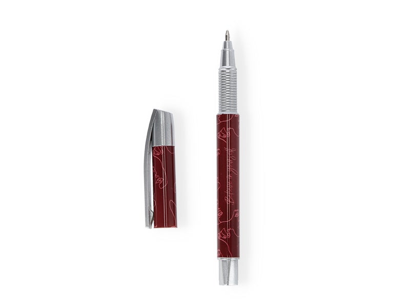 Diseño: este bolígrafo tiene un diseño muy especial, con estampado en color granate. ¡Es precioso! La tapa y el borde inferior son de color plata.