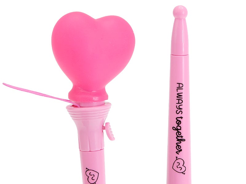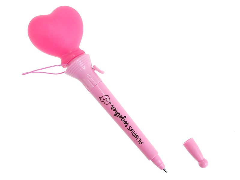 Diseño: bolígrafo rosa con frase ‘always together’ con “juguete volador” en uno de sus extremos, y en el otro una tapa que protege la punta del boli. El juguete tiene forma de corazón rosa, y justo debajo hay una palanca o clic que, al presionarlo, el juguete saldrá disparado pero el elástico impedirá que se suelte y se pierda.