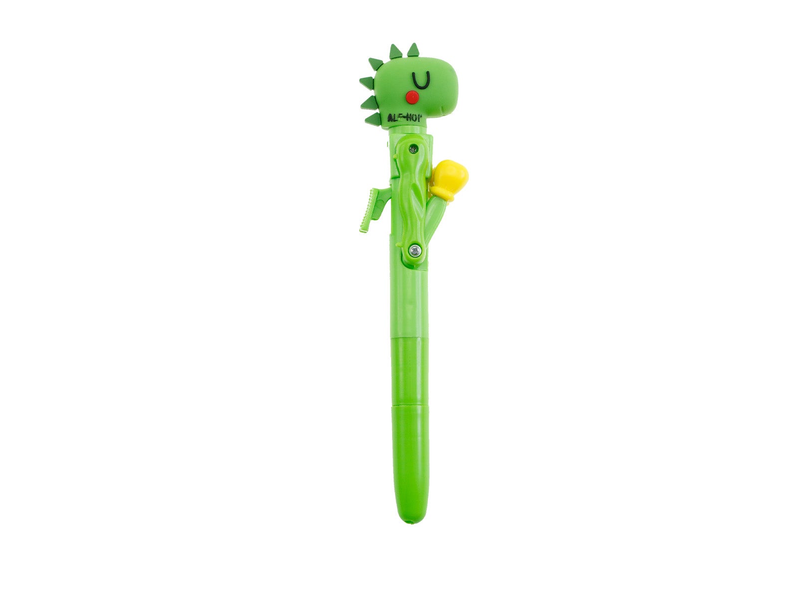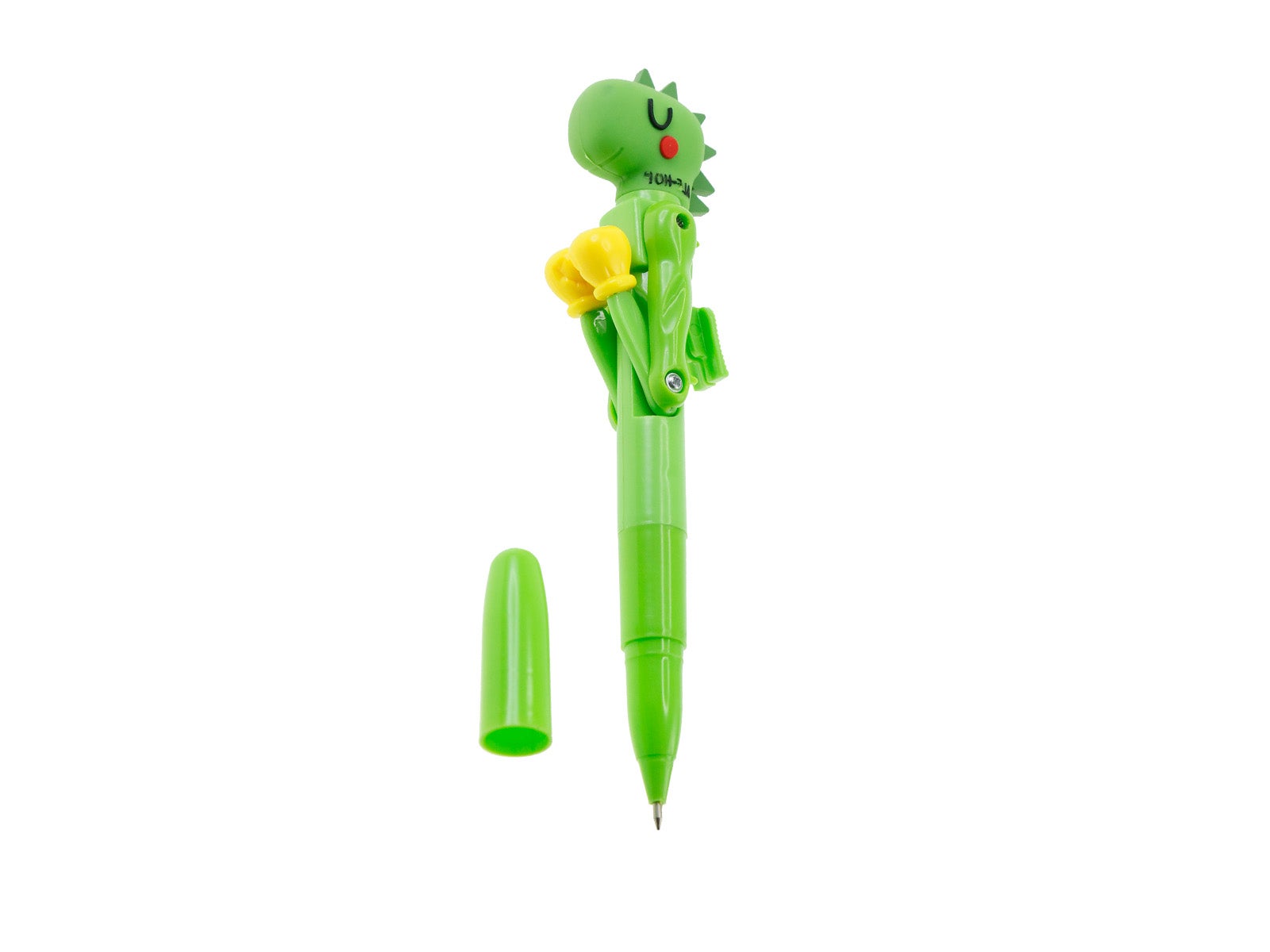 Diseño: bolígrafo verde que en el extremo superior tiene un dinosaurio con brazos y guantes de boxeo amarillos.