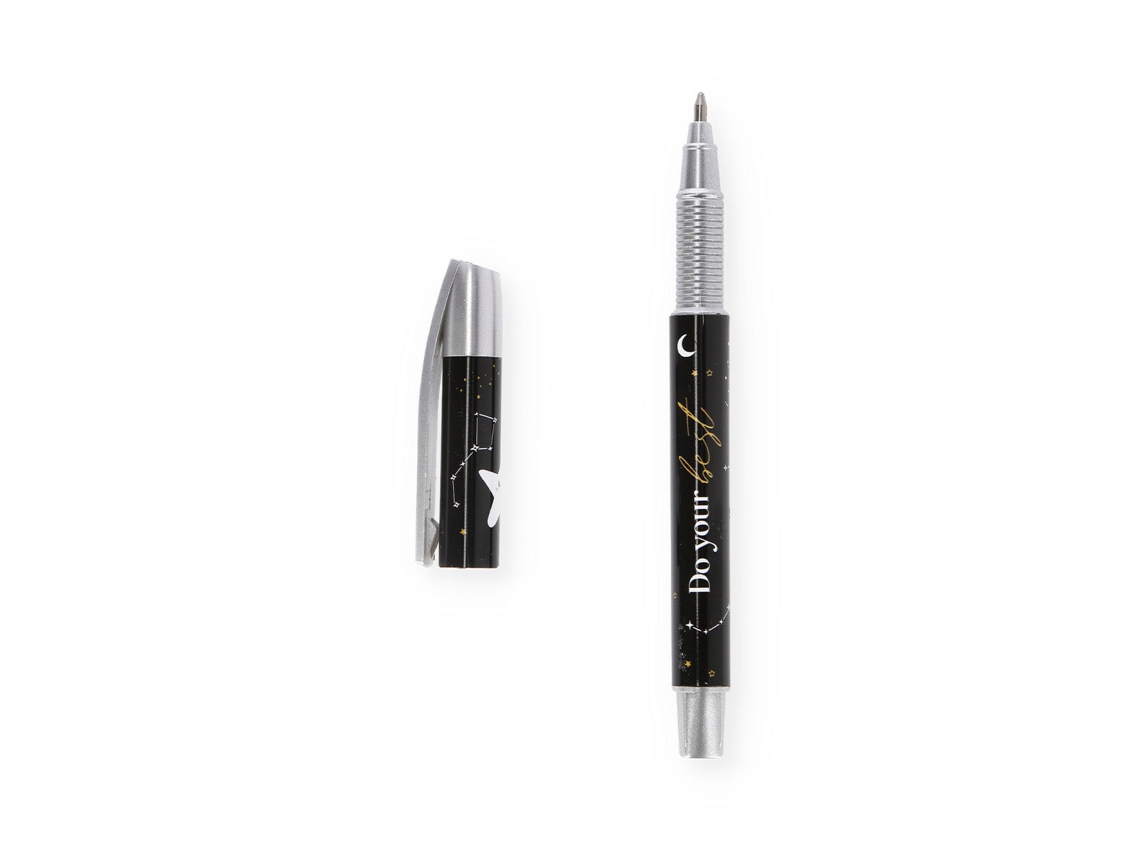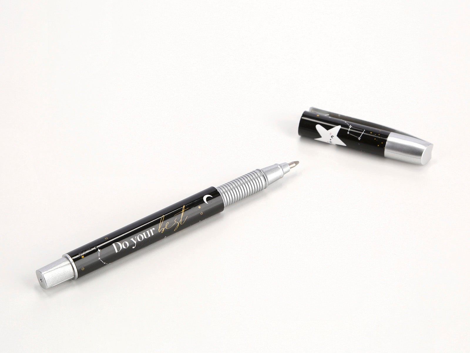 Este bolígrafo no es solo un instrumento de escritura, es un auténtico estímulo visual. Con su cuerpo negro elegante y detalles en blanco y dorado, adquiere un aire sofisticado y chic. Y ¿has visto esa tapa con un clip metálico? No solo es super práctico para llevarlo en el bolsillo o engancharlo en tus libretas, sino que su diseño ornamental con líneas y puntos la convierte en toda una obra de arte.