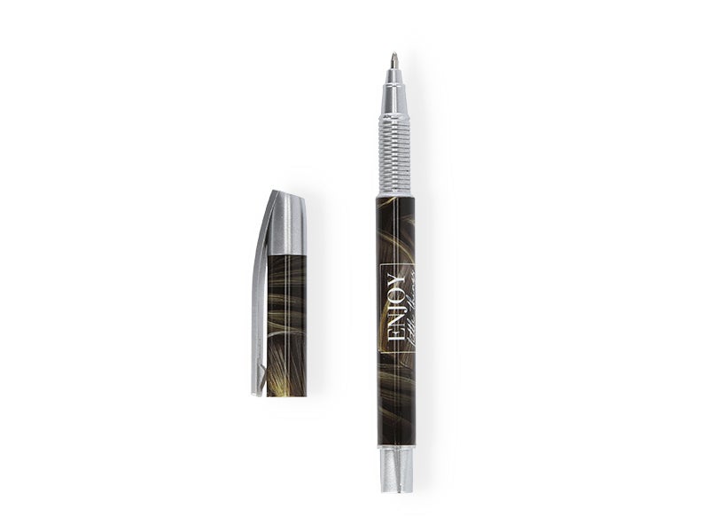 Diseño: este bolígrafo tiene un diseño muy especial, con estampado en tono negro. ¡Es precioso! La tapa y el borde inferior son de color plata.