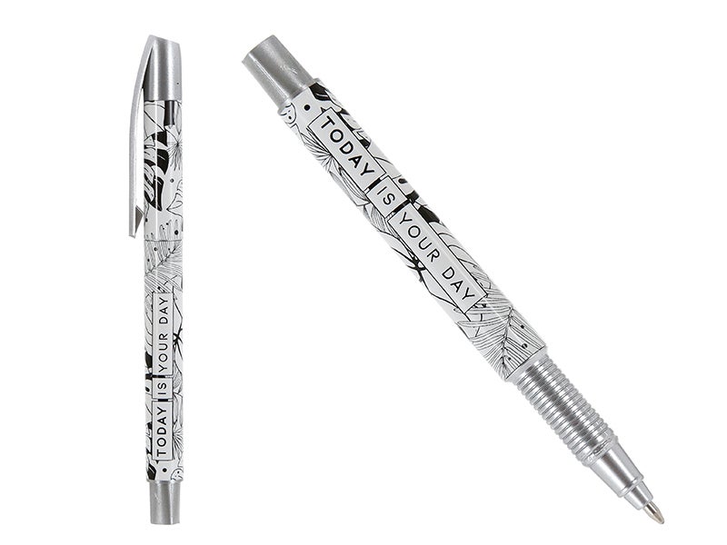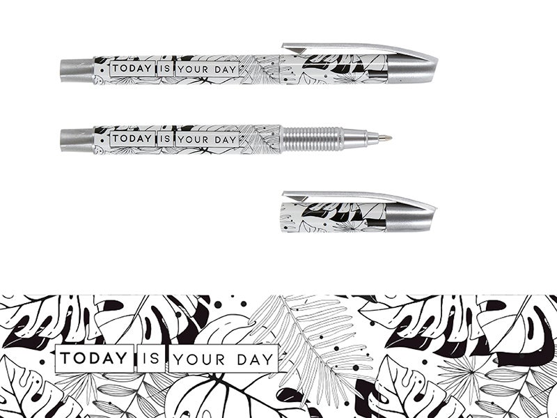 Diseño: este bolígrafo tiene un diseño muy especial, con estampado de hojas negro y blanco. ¡Es precioso! La tapa y el borde inferior son de color plata. Frase: Today is your day.