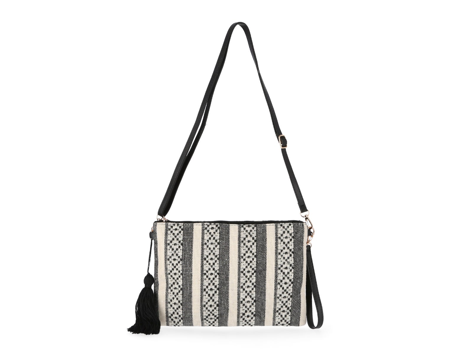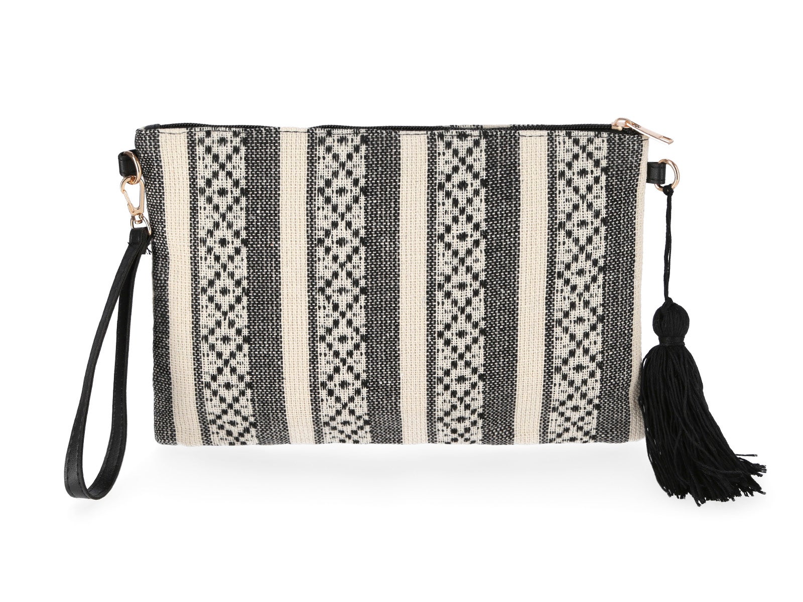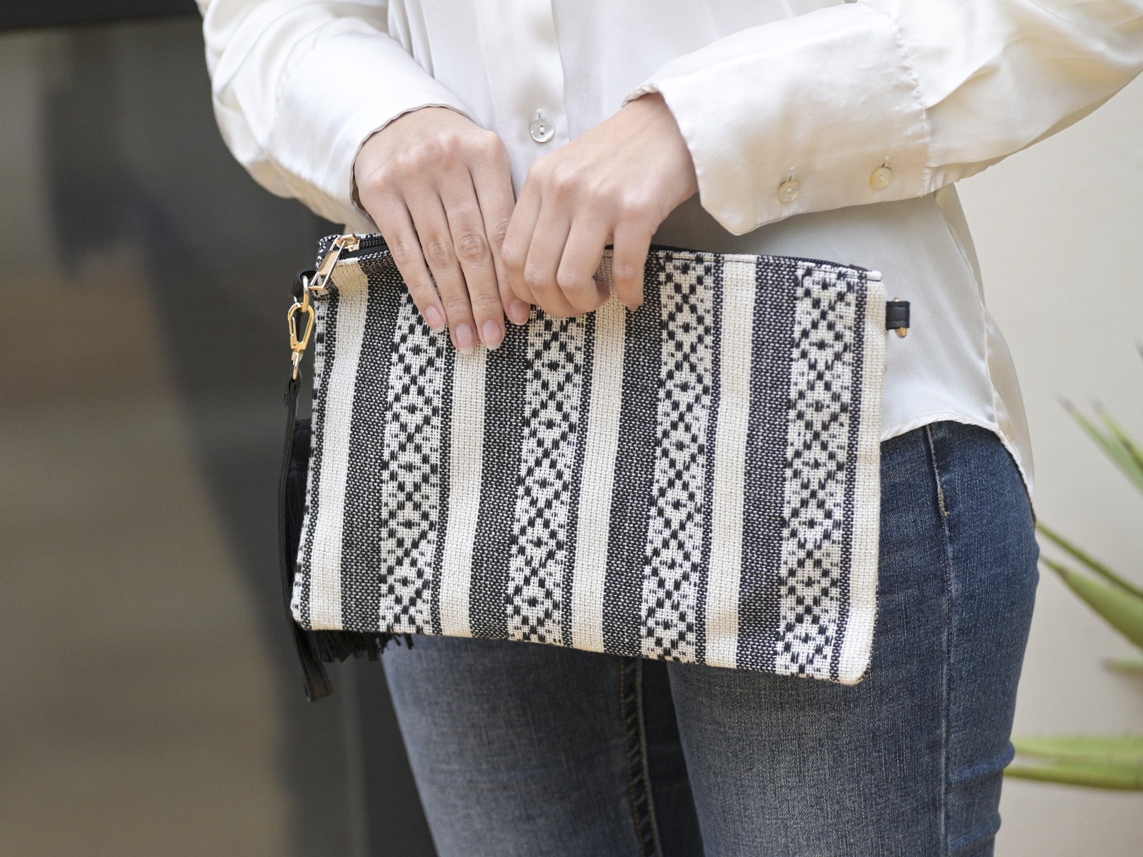 Accesorio Chic Geométrico con estampados en blanco y negro, borlón y cremallera dorada, diseño portable con correa de mano y calidad premium. Destacado en ALE-HOP.