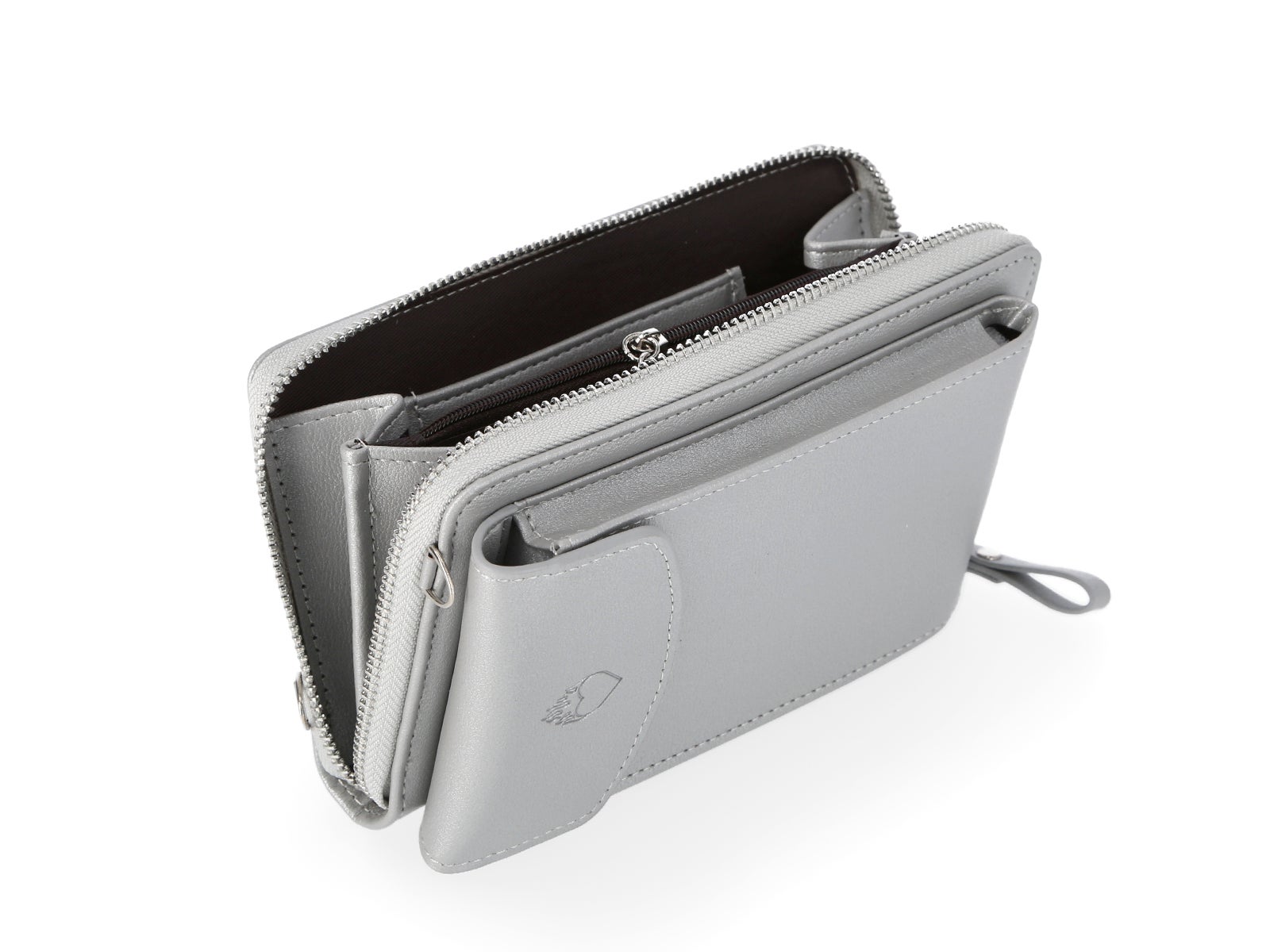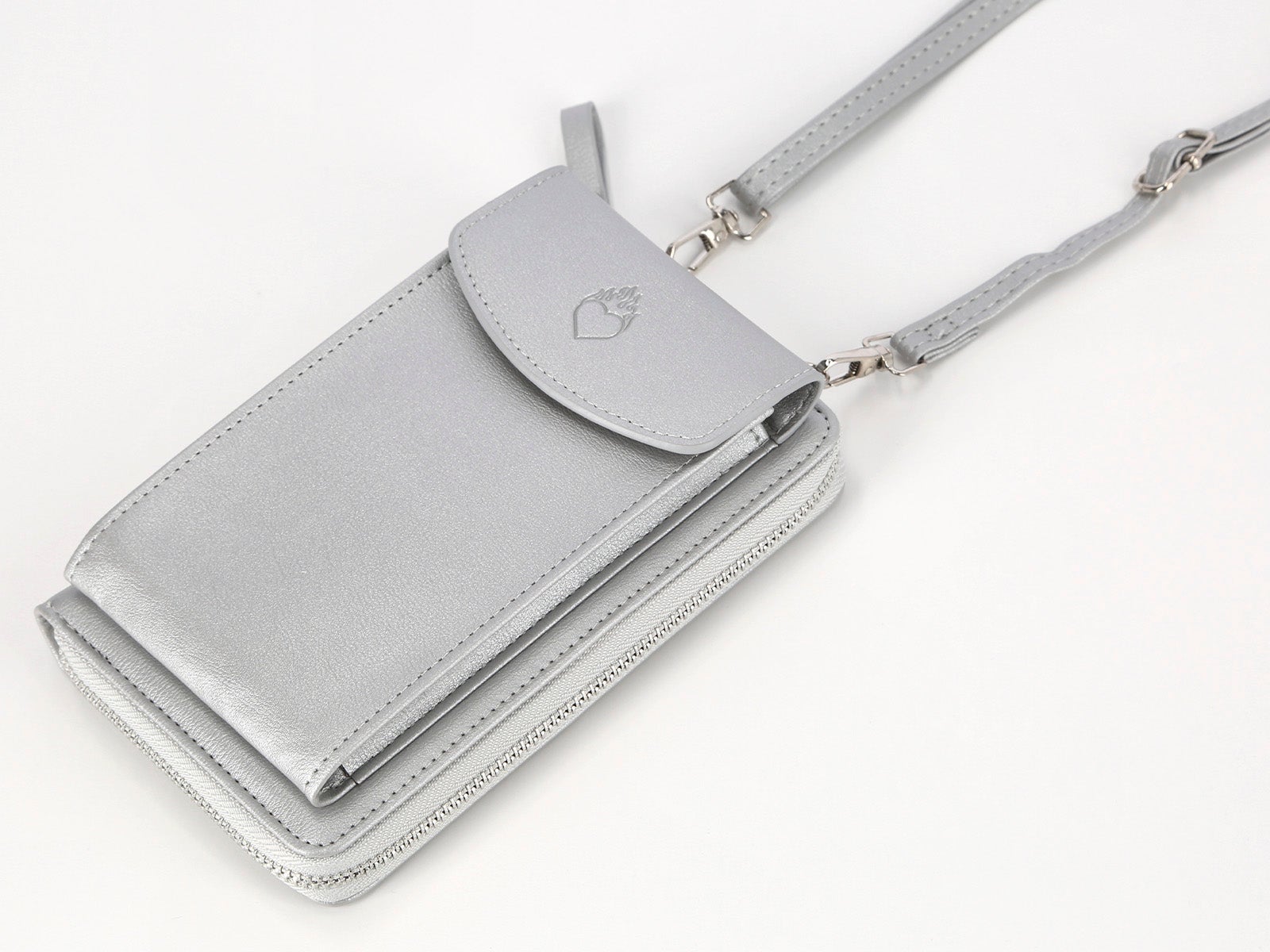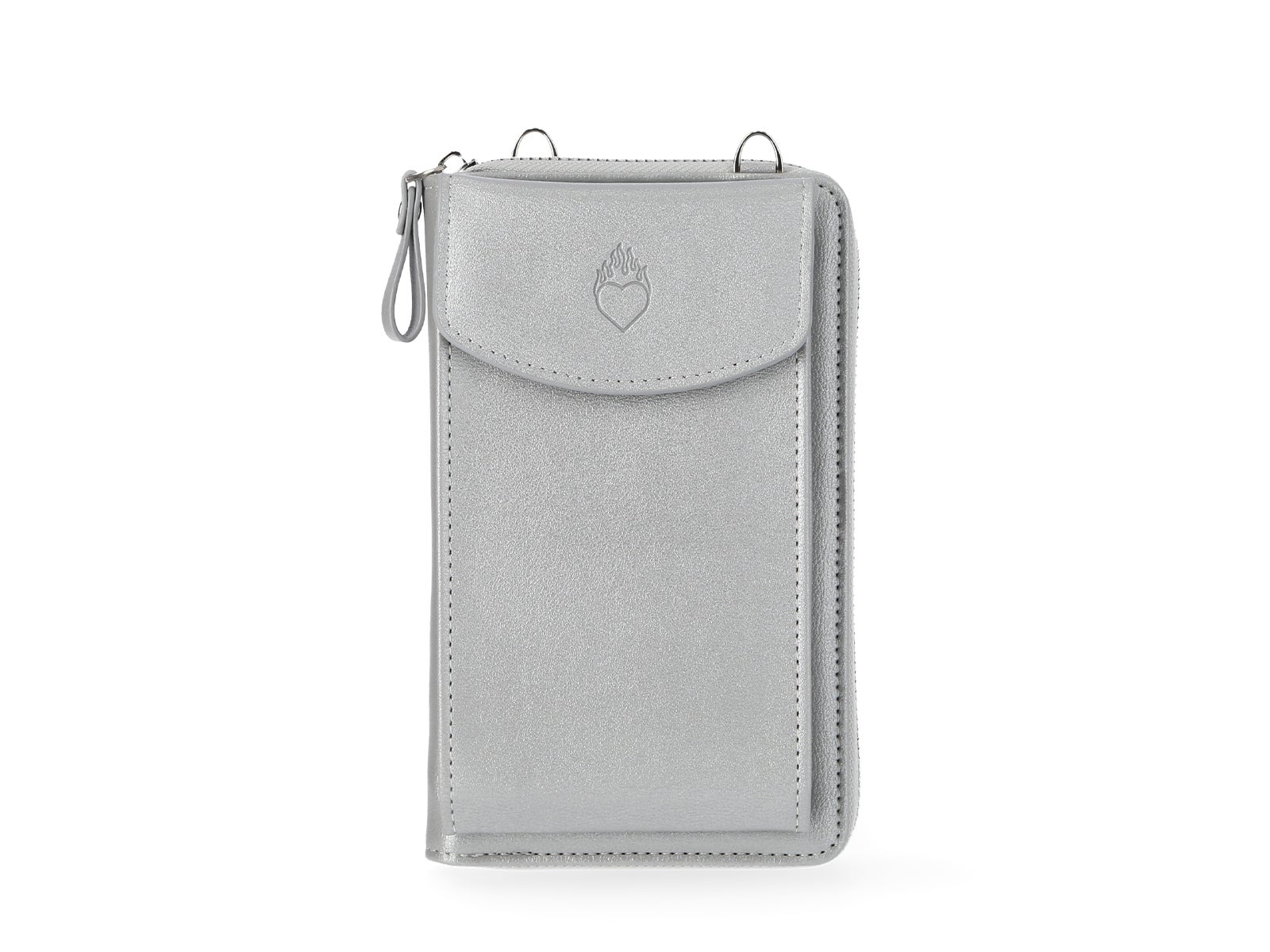 El bolso porta móvil y monedero plateado corazón de ALE-HOP es tu aliado perfecto para mantener la elegancia y la funcionalidad. Deja que el corazón hable por ti mientras organizas todo en un solo lugar.
