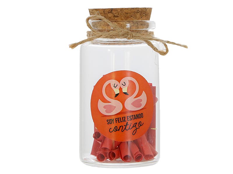 Guarda tus emociones con el Bote mensajes - Feliz contigo de ALE-HOP. Un frasco transparente con mensajes de amor enrollados en rojo, tapón de corcho y cuerda rústica. Tiene un diseño vintage y una etiqueta circular con ilustración de flamencos formando un corazón.