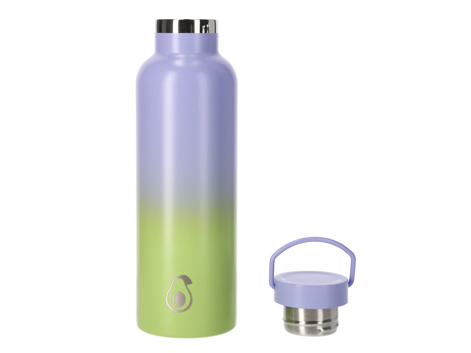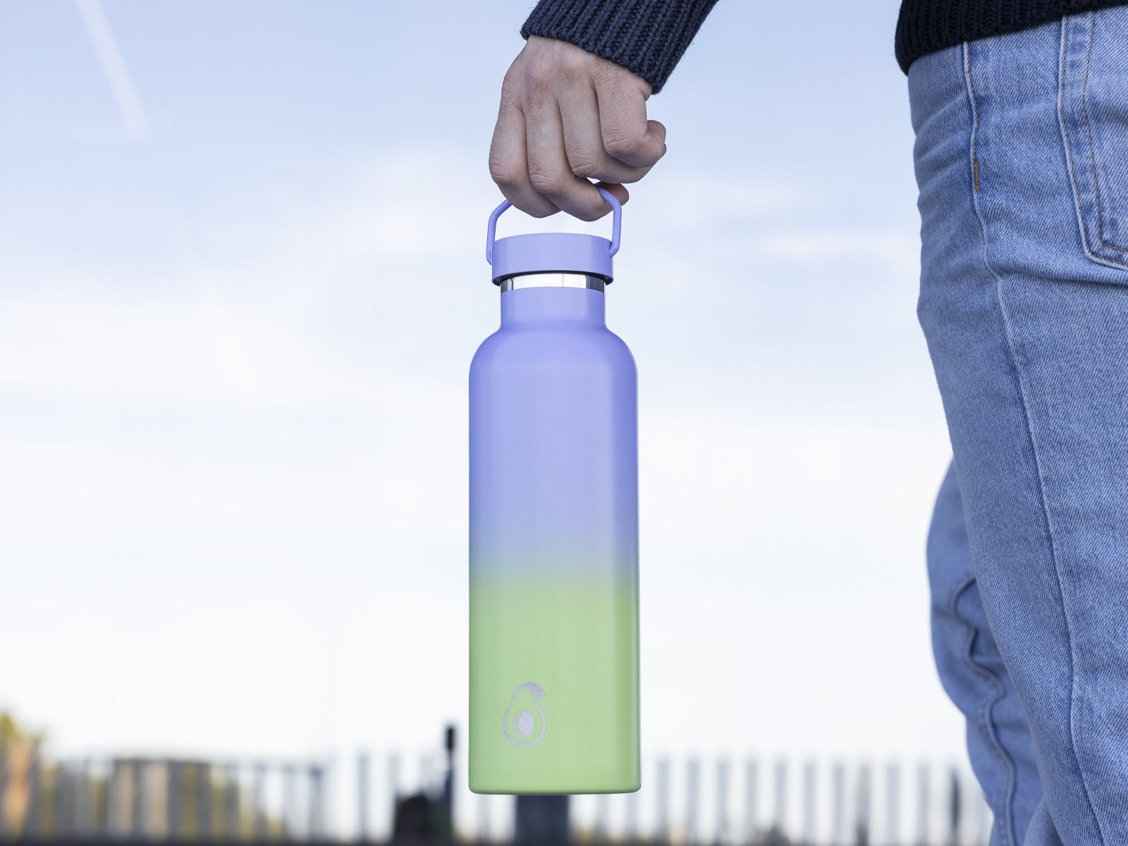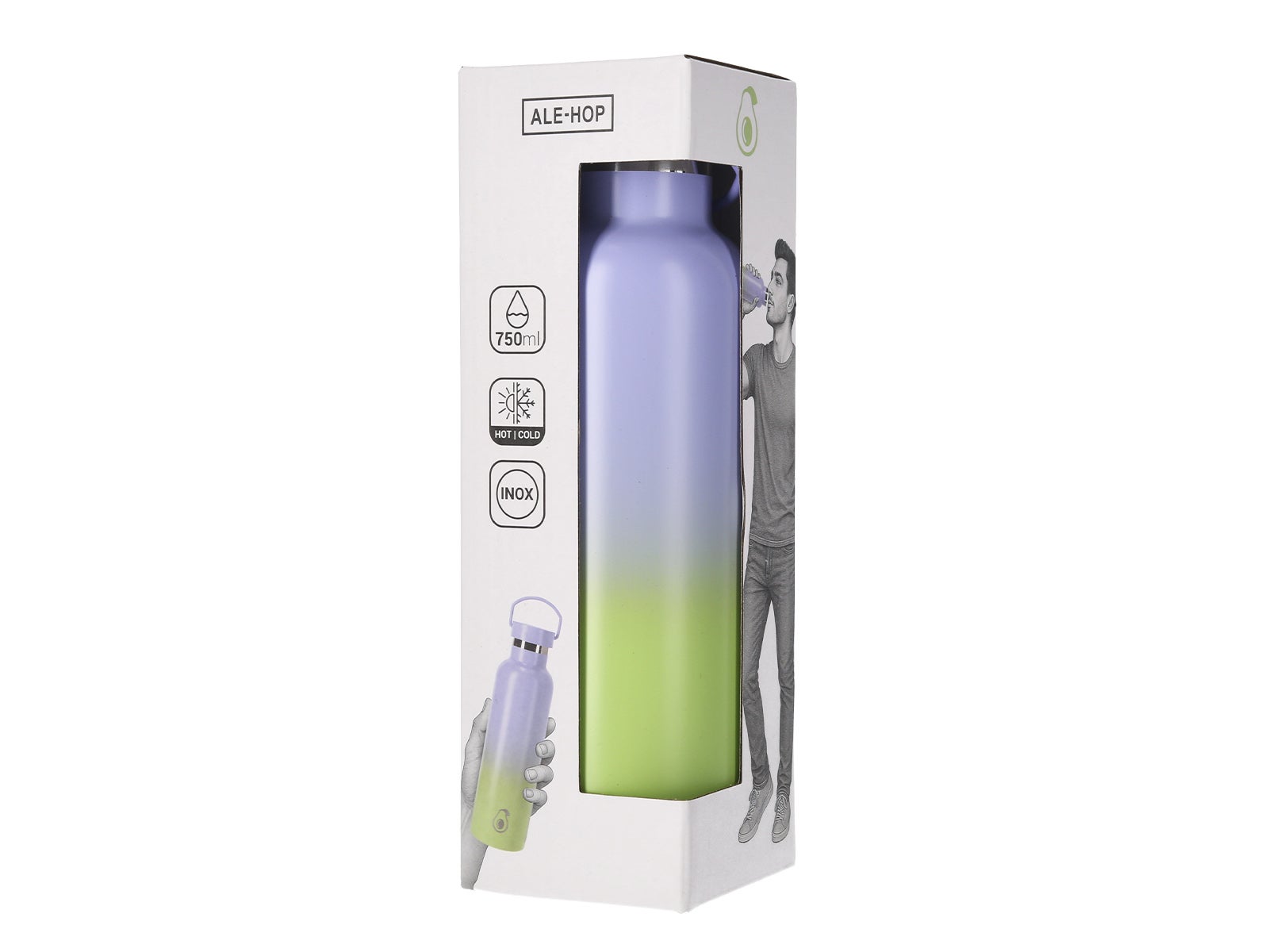 Botella térmica 750 ml con diseño degradado lila y verde. Reutilizable, cómoda y perfecta para llevar agua o tu bebida favorita a la oficina, clase, gimnasio o escapadas con el estilo desenfadado de ALE-HOP.