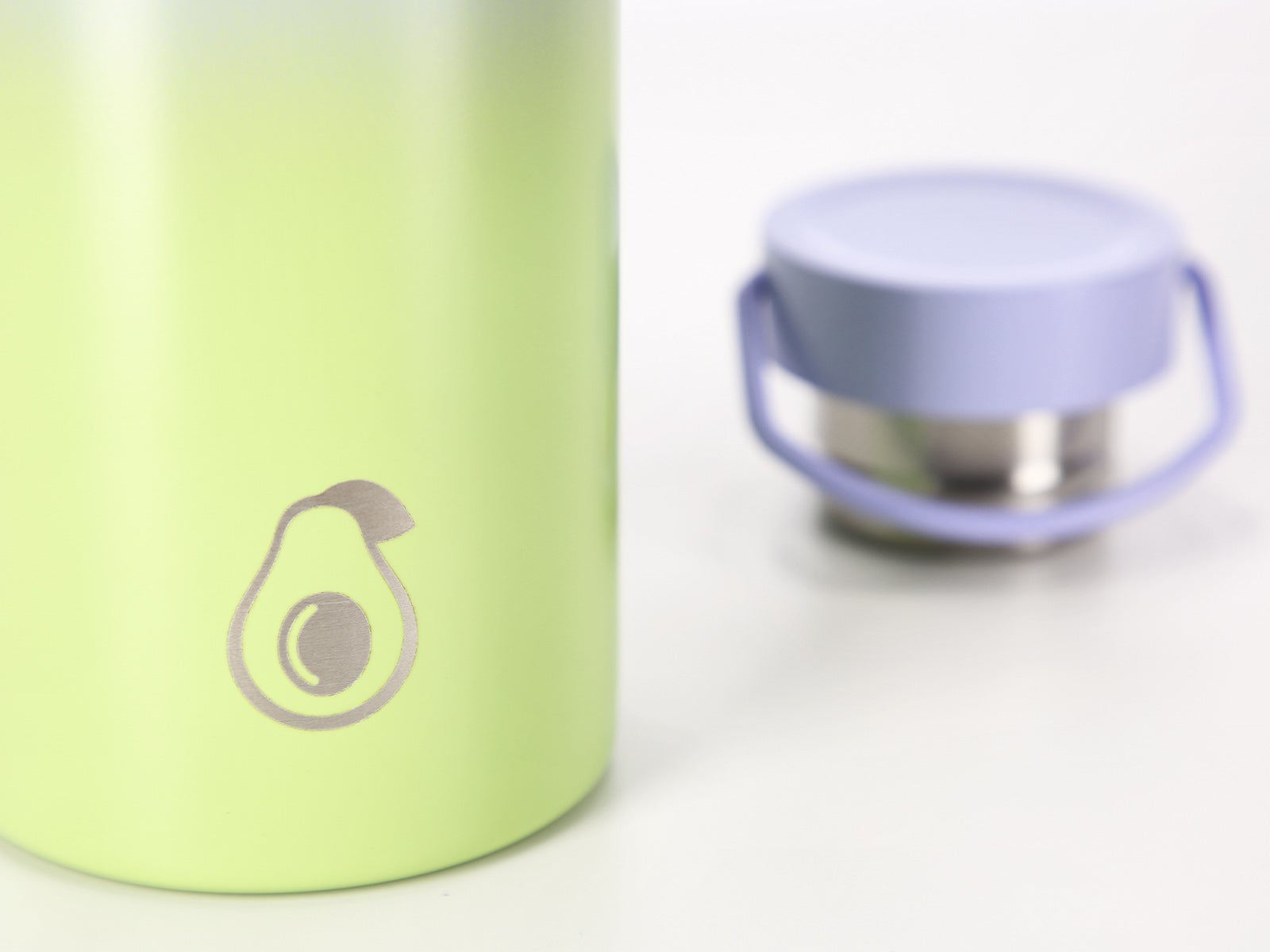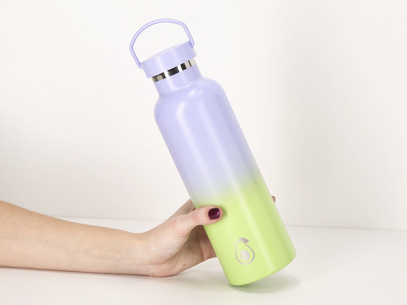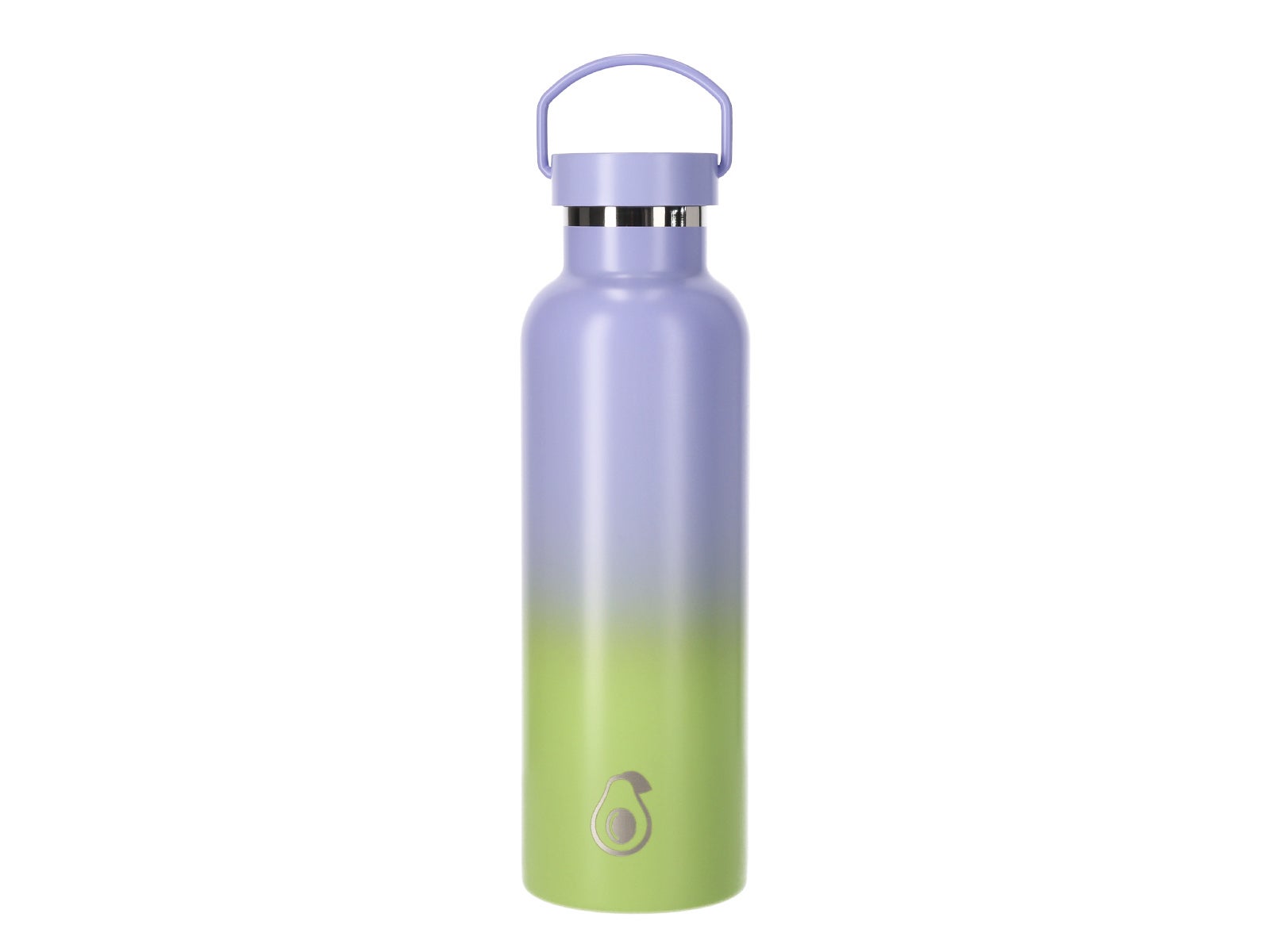 Botella térmica 750 ml con diseño degradado lila y verde. Reutilizable, cómoda y perfecta para llevar agua o tu bebida favorita a la oficina, clase, gimnasio o escapadas con el estilo desenfadado de ALE-HOP.