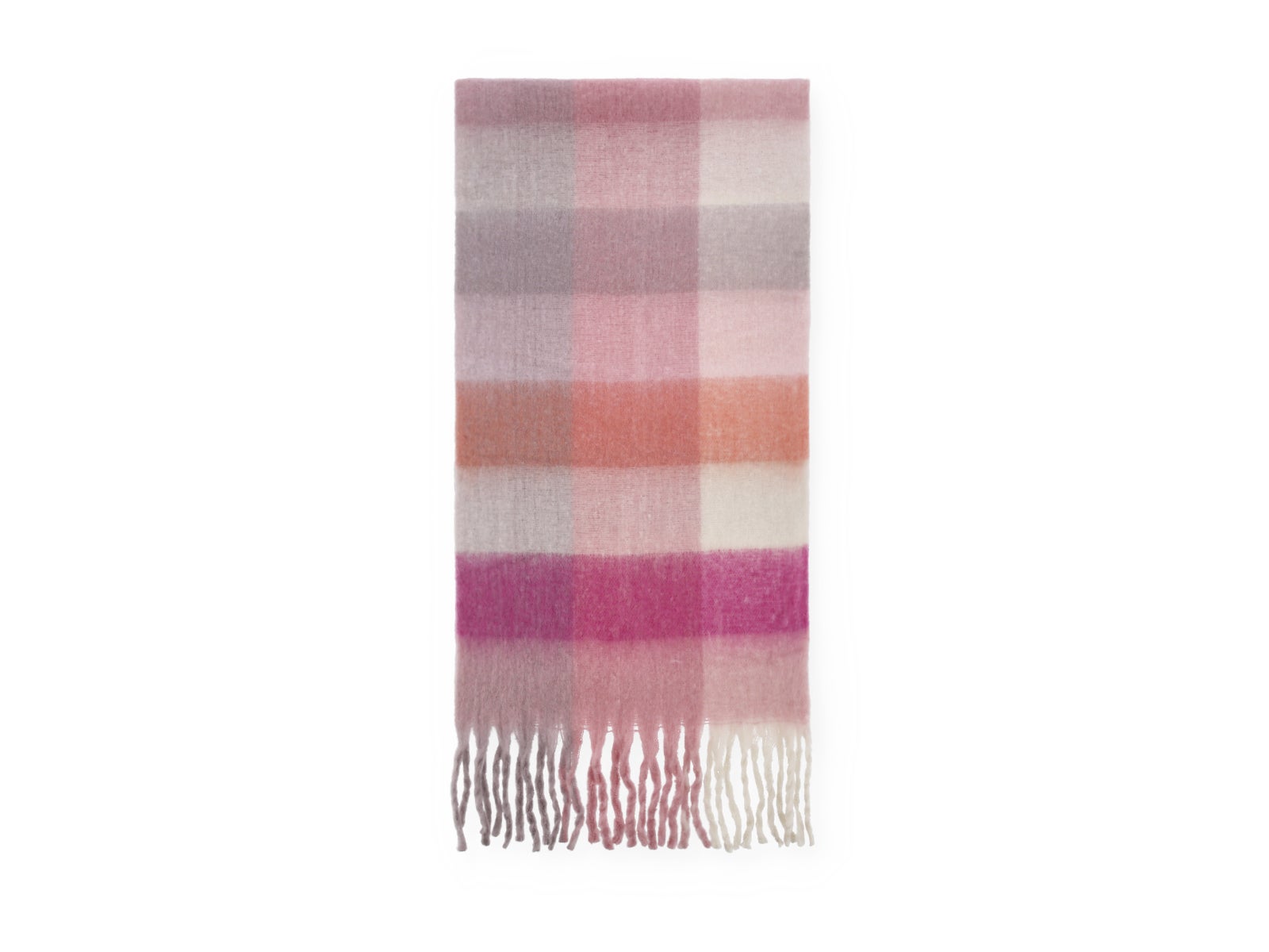 ¡Elige la Bufanda con flecos y cuadros rosada y dale a tus atuendos un toque único que atrapará todas las miradas!