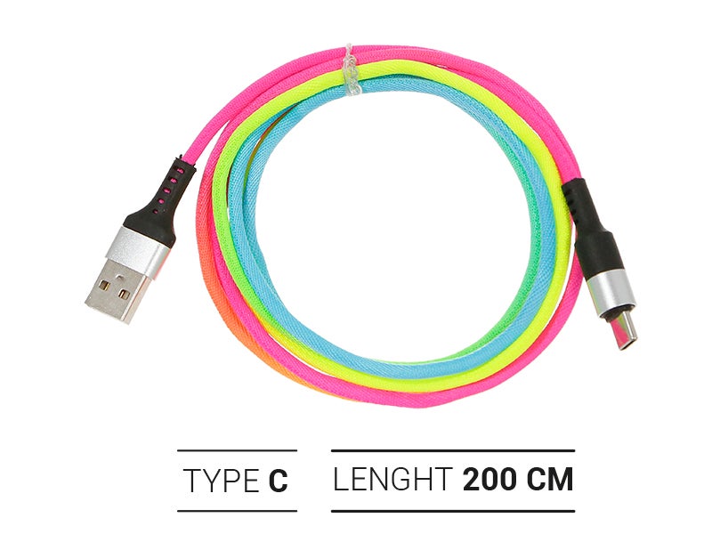 Cable USB a Tipo-C Multicolor de 200 cm de ALE-HOP. Carga tus dispositivos con estilo y transfiera datos fácilmente. Compatible con cualquier dispositivo con puerto Tipo-C. Añade un toque de color a tu espacio con su diseño vibrante.