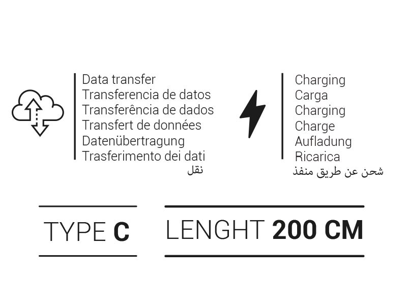 - Medidas: El cable tiene una longitud de 200 cm para que no te quedes corto mientras usas tu móvil o tablet cuando están cargando.