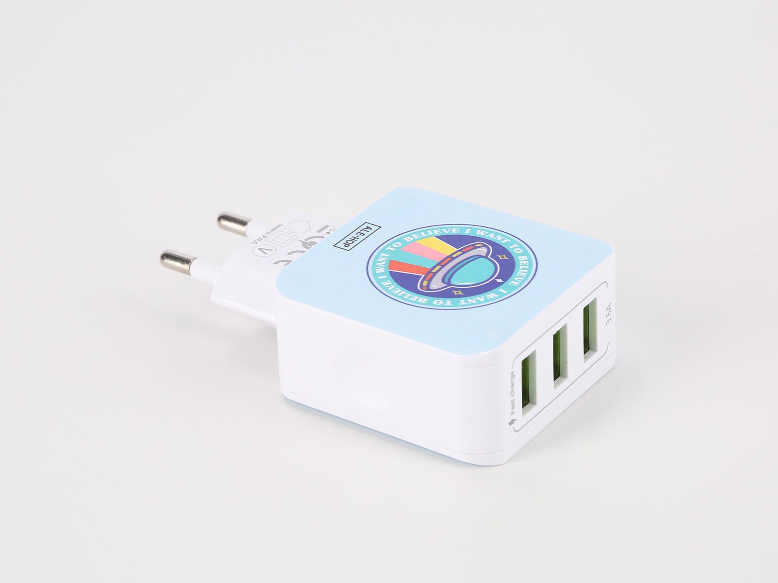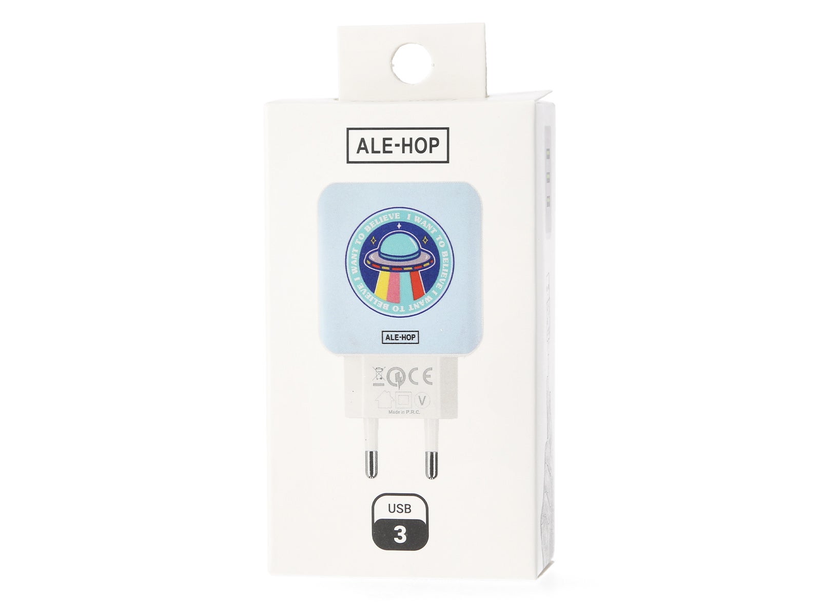 Cargador USB alienígena ALE-HOP con triple puerto y lema "I WANT TO BELIEVE". Universal, potente y portátil, para viajeros que aman la tecnología con estilo.
