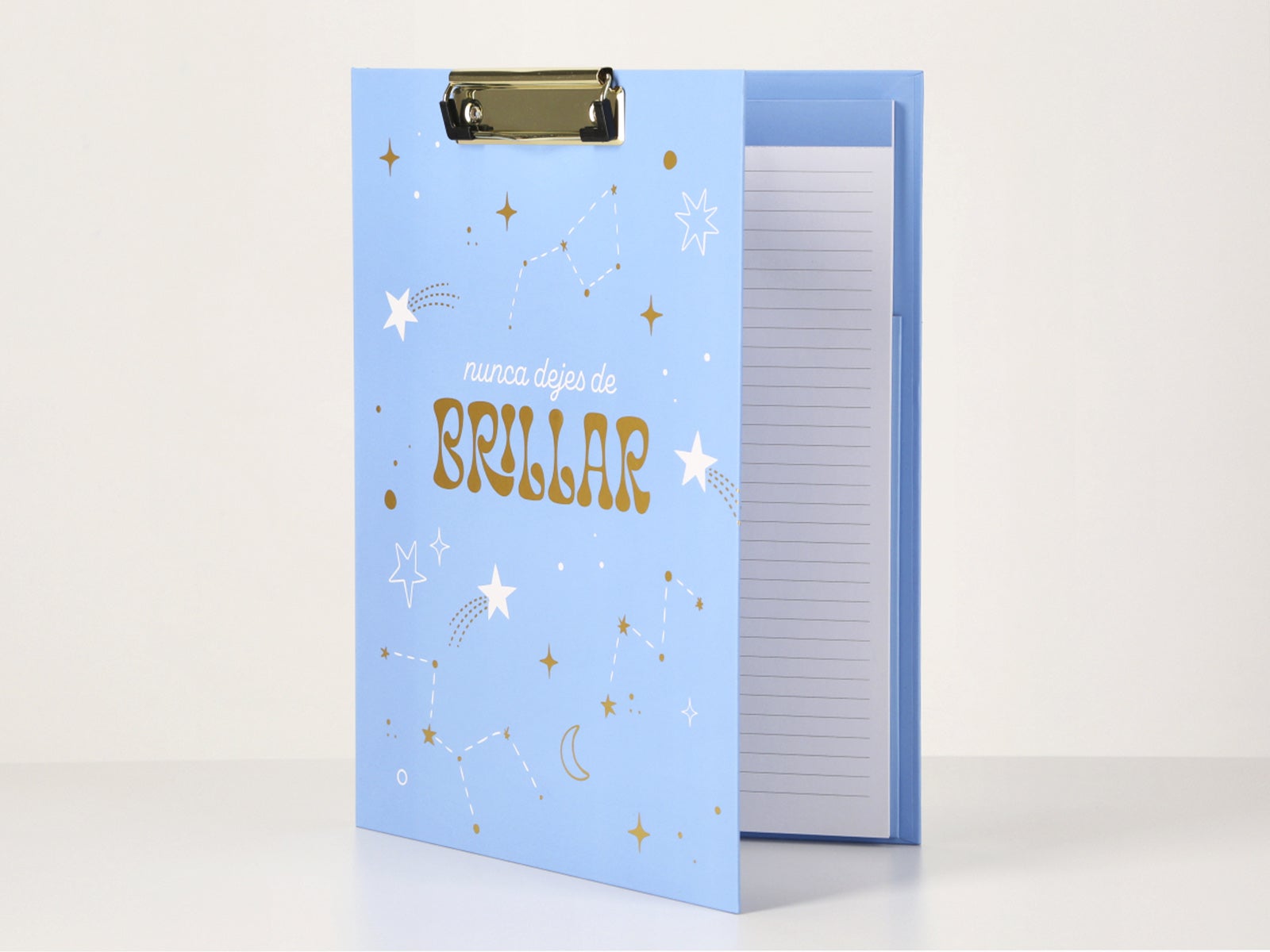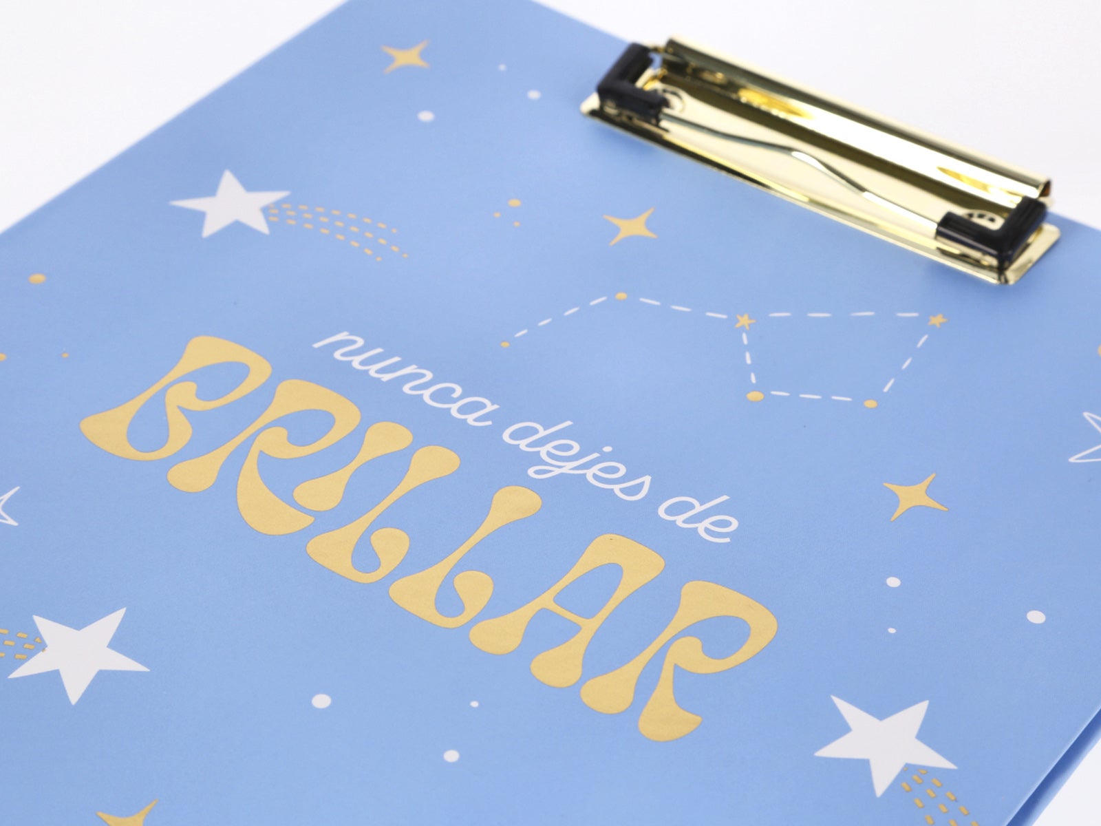 - Carpeta clip metálico “Nunca dejes de brillar” – Diseño estrellado