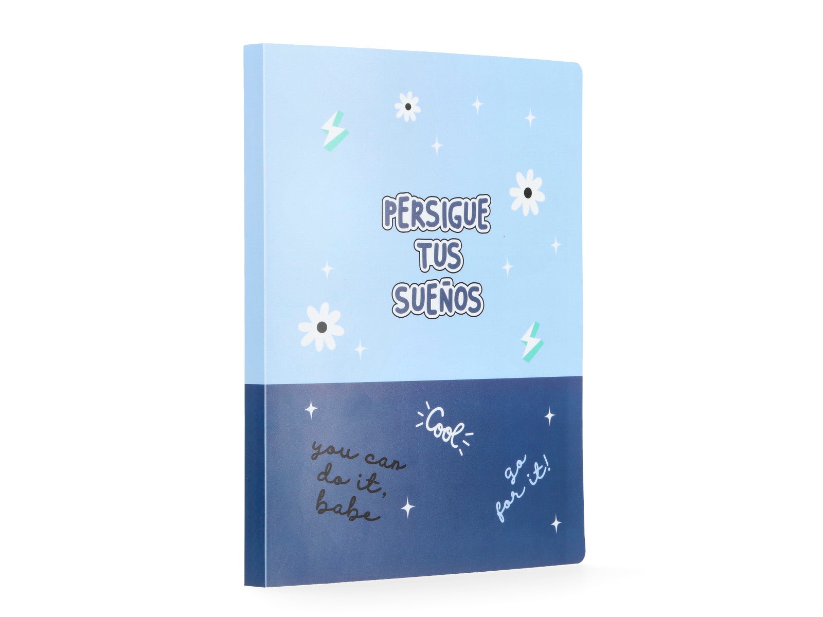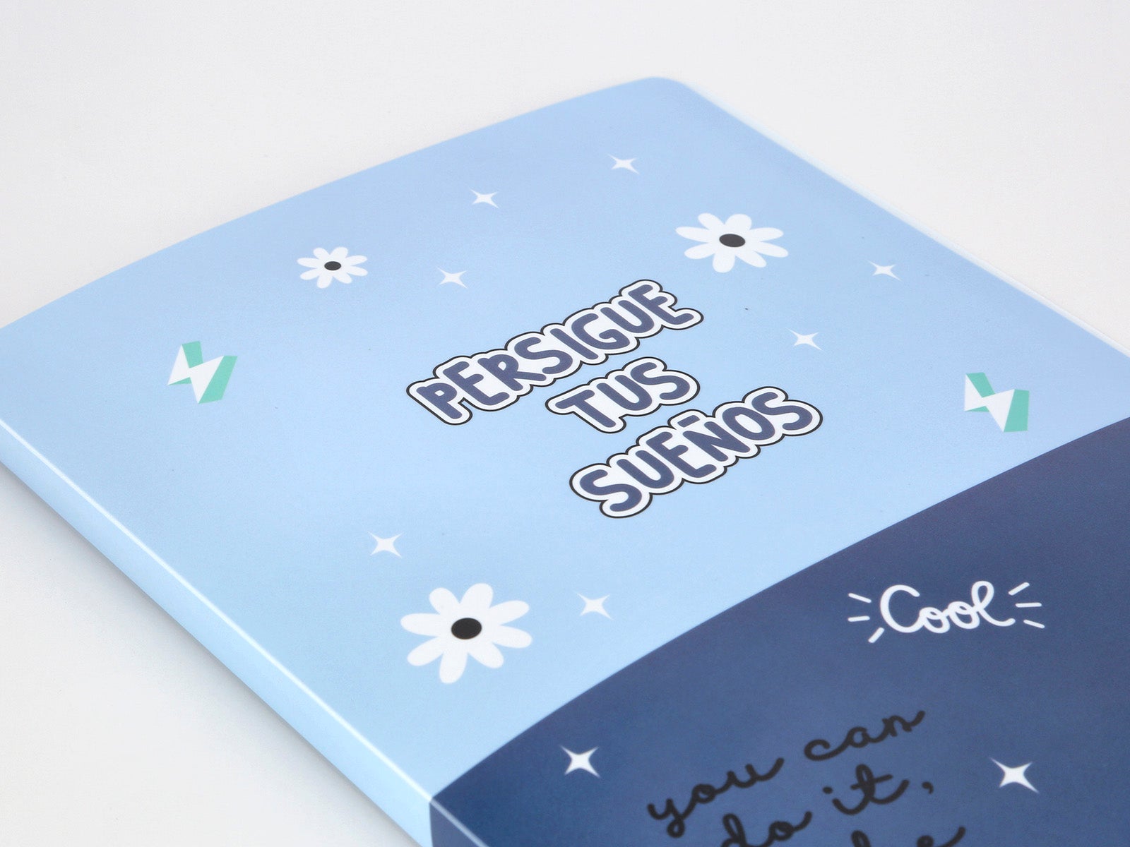 Creada para soñadores, esta carpeta tiene un diseño optimista y moderno. Su portada es de un azul claro precioso que se oscurece hacia el borde inferior hasta convertirse en azul marino. Decorada con estrellas blancas, flores y pequeños detalles geométricos en tonos verdes, cada vez que la veas te recordará que debes perseguir tus sueños.