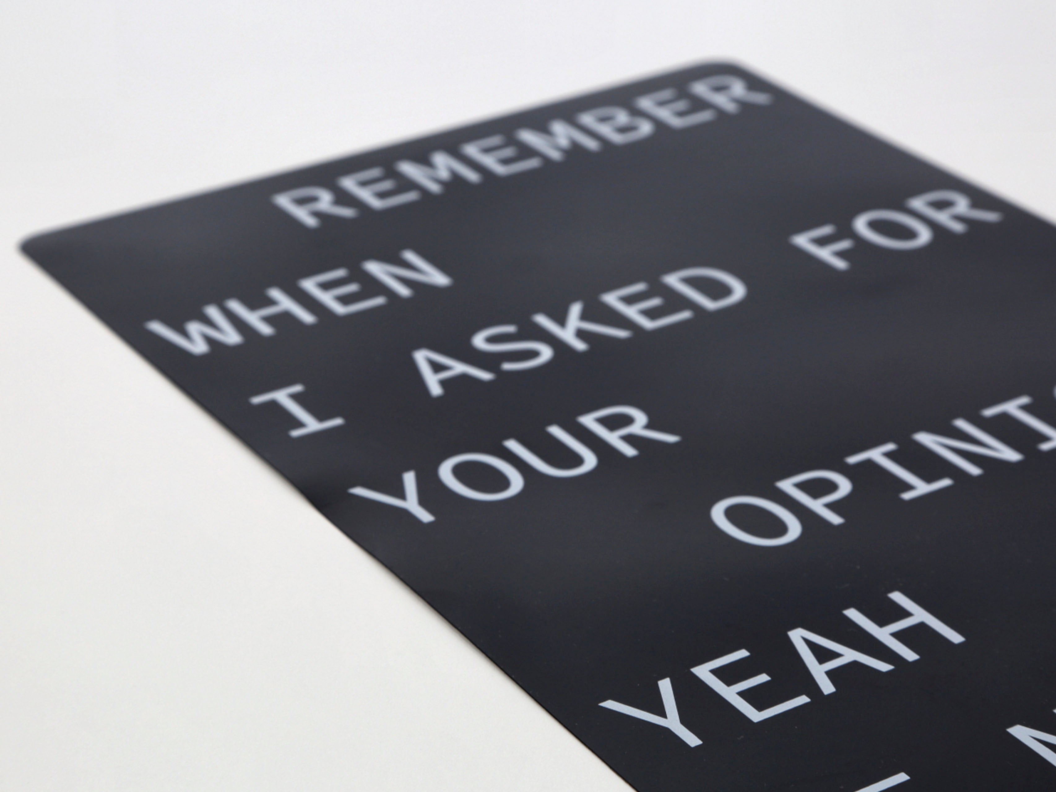 - Mensaje: "REMEMBER WHEN I ASKED FOR YOUR OPINION? YEAH, ME NEITHER", para ofrecer al ambiente un toque humorístico y desenfadado.