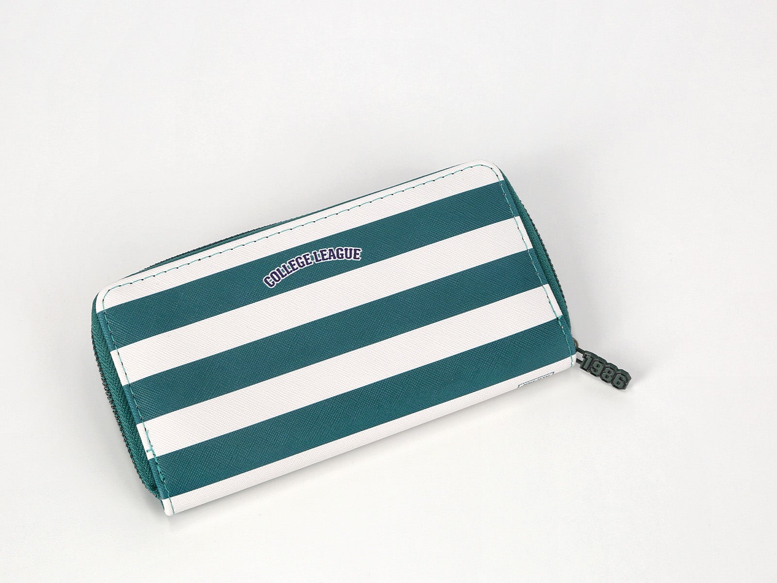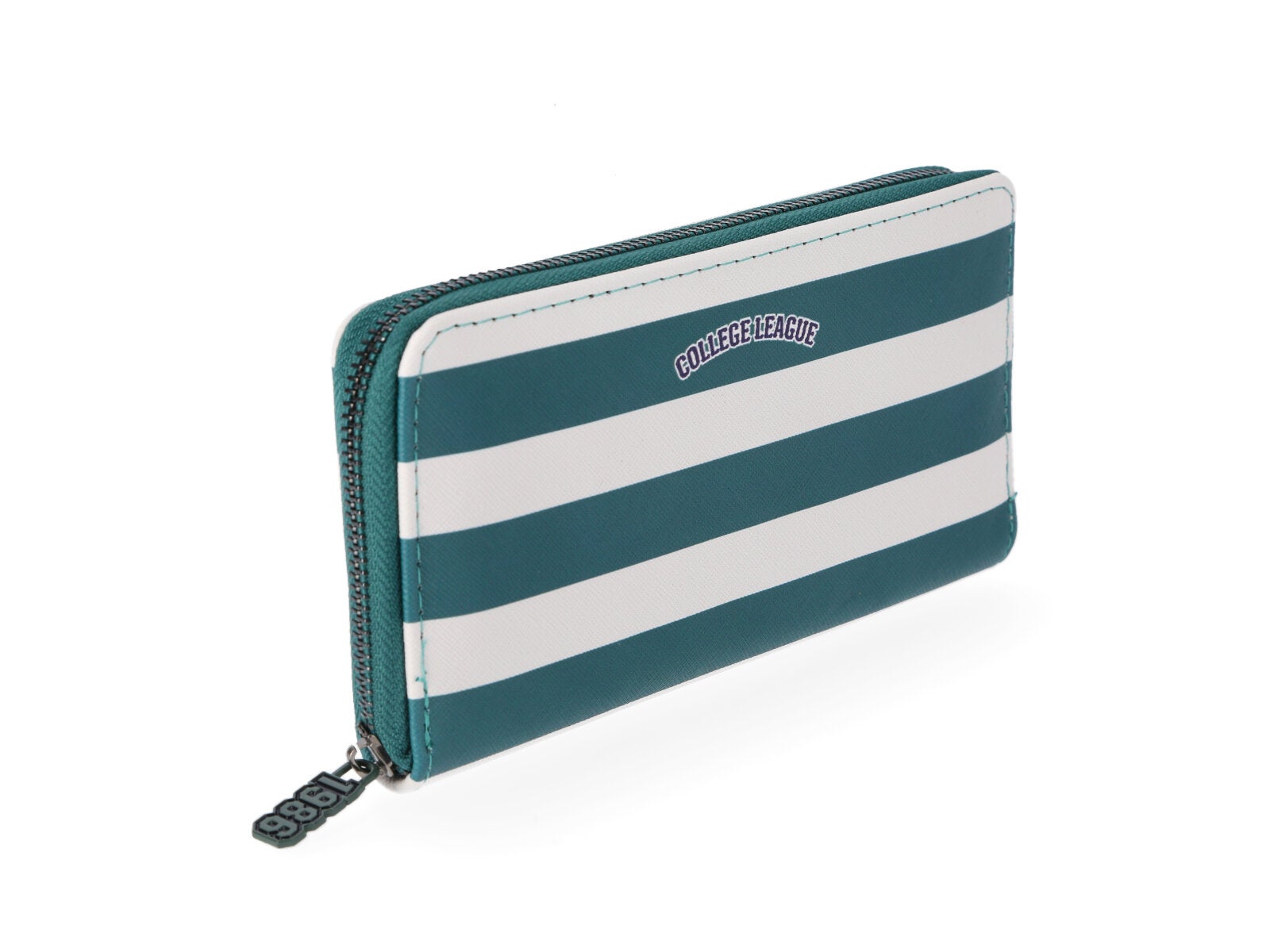 Diseño: estampado de colores blanco y verde turquesa con la frase "college league".