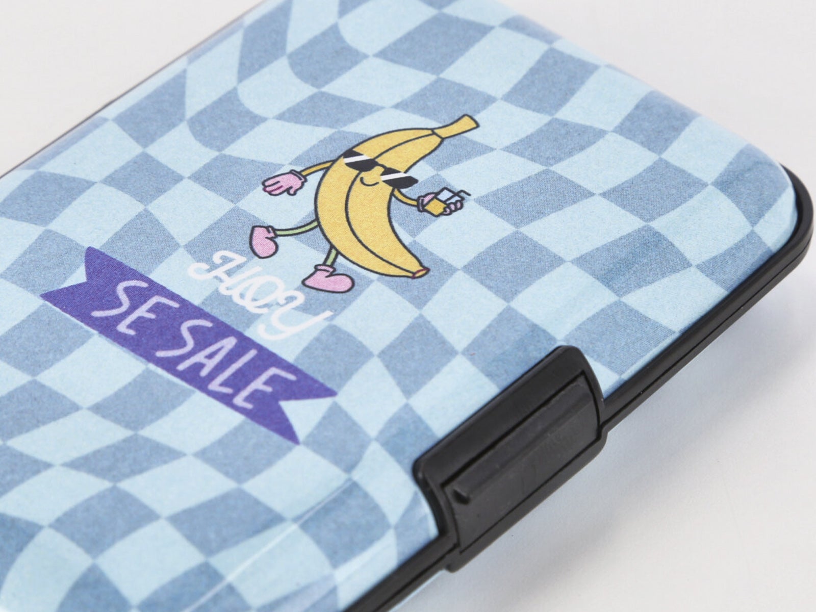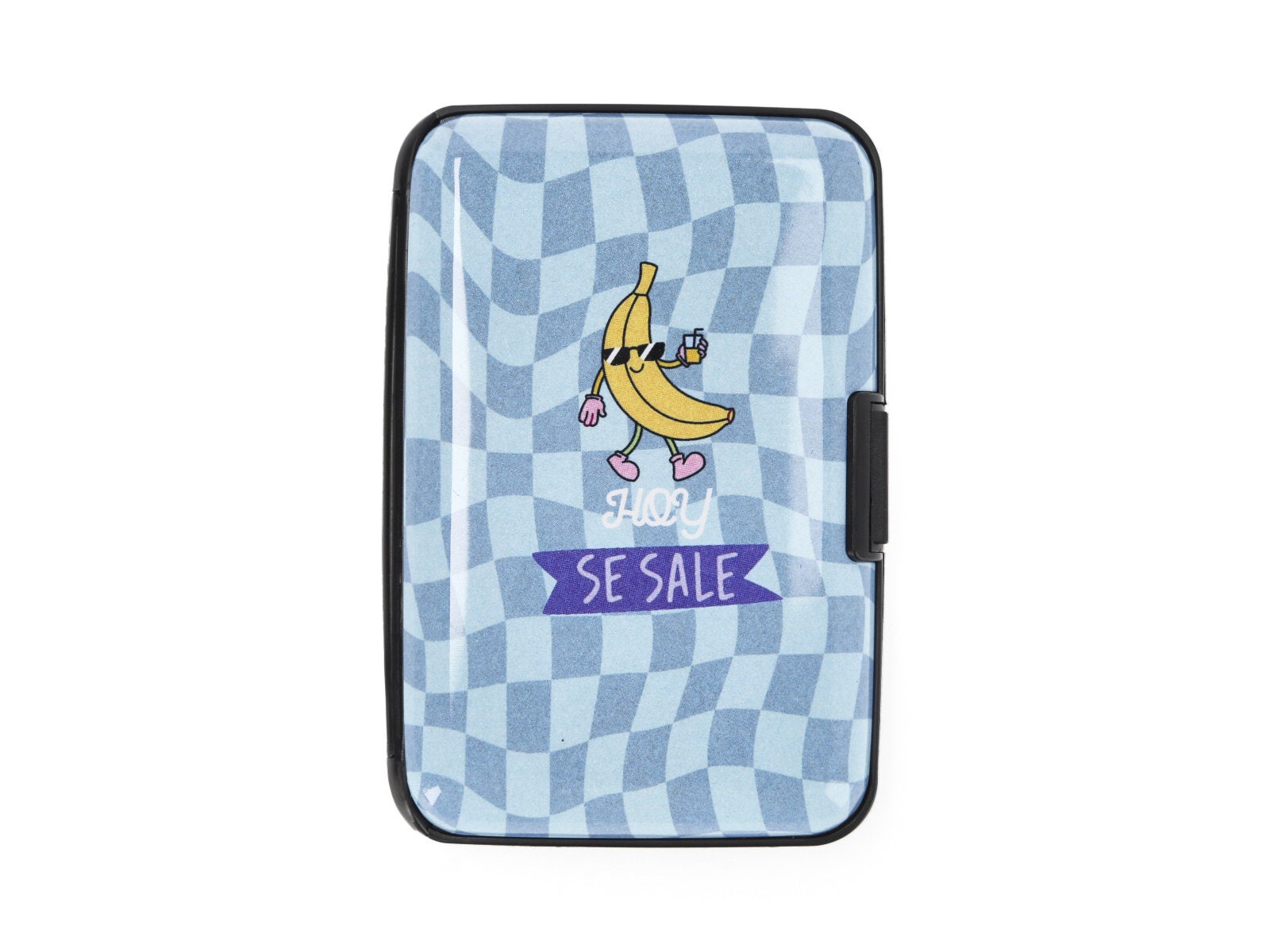 Conoce la divertida Cartera protege tarjetas - SE SALE de ALE-HOP, perfecta para llevar tus tarjetas con estilo y a salvo. Esta peculiar cartera destaca por su diseño de cuadros en tonos azul claro y blanco, acompañada de una simpática ilustración de un plátano que parece estar listo para una fiesta.