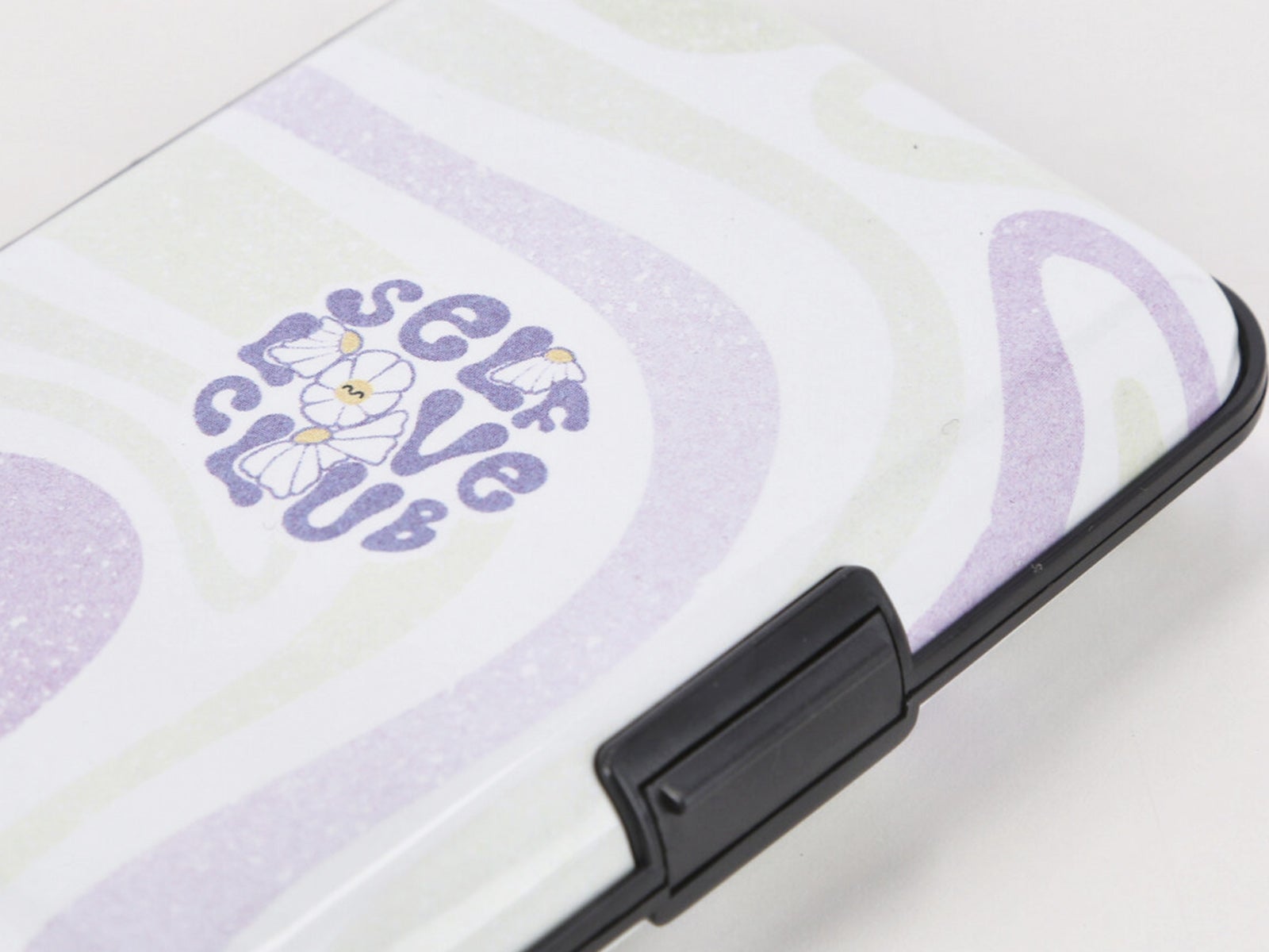 - Diseño único: Adornado con un patrón abstracto de formas curvas en tonos de lila y blanco, acompañado de un emblema central que proclama orgullosamente "SELF LOVE CLUB".