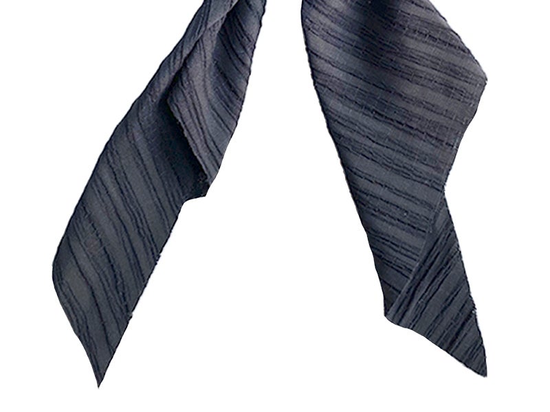 Diseño: coletero de tela negra a rayas con dos lazadas.