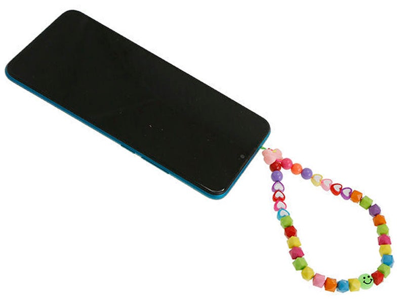 Collar con cuentas de forma de corazones multicolor, con hilo resistente que soportará el peso de tu móvil.