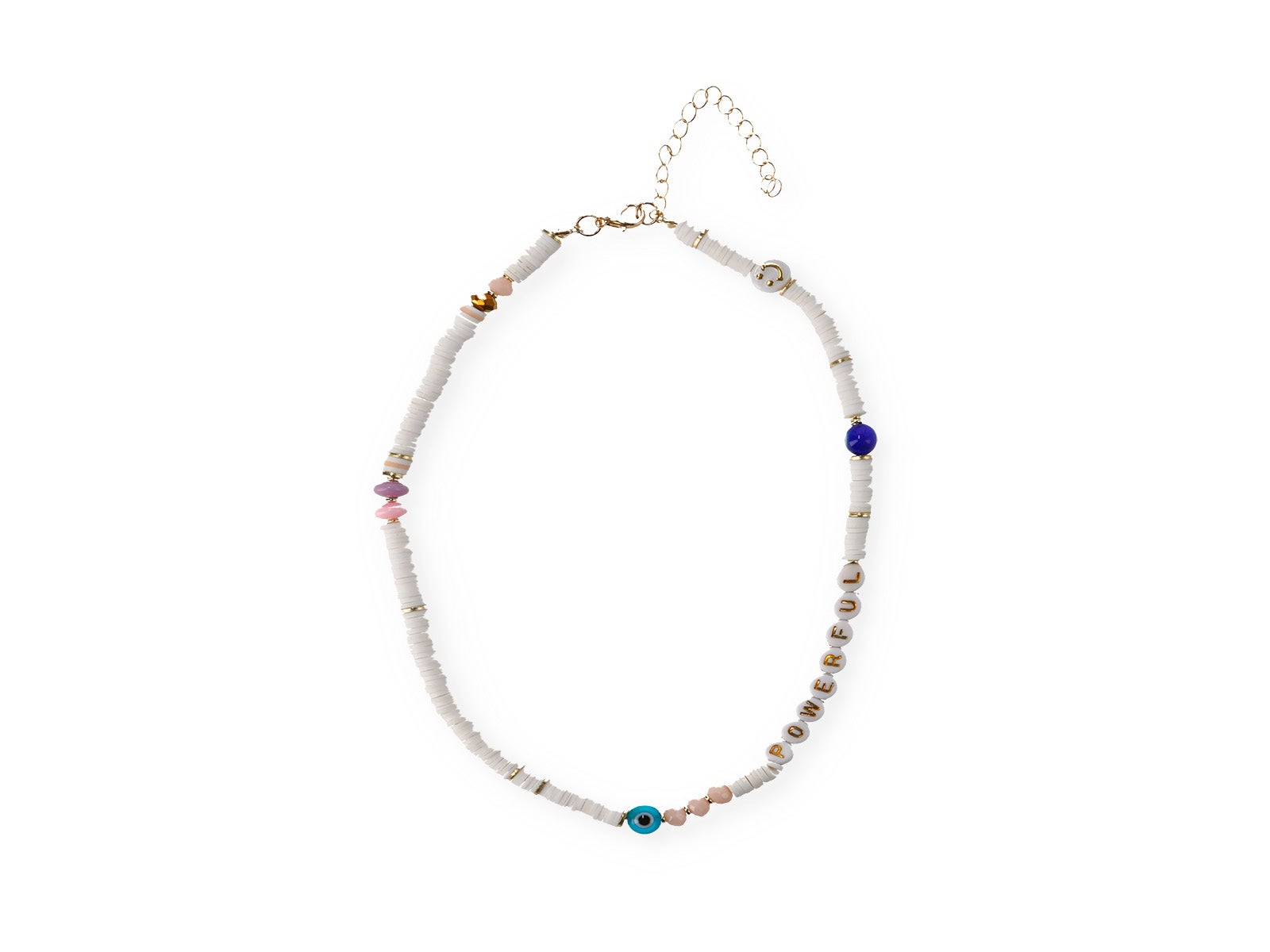 El Collar Blanco - Powerful de ALE-HOP es una obra maestra, llena de color y diseño único. Con cuentas de distintas formas y la palabra "POWERFUL" en metálico es el toque final perfecto para tus outfits. Ajustable y elegante.