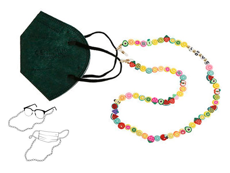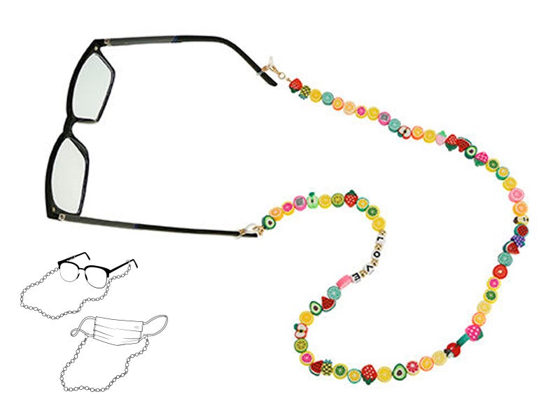 Diseño: cordón de bolitas multicolor y diferentes formas de fruta. Con adaptadores regulables de silicona en los extremos para que los adaptes a la patilla de tu gafa.