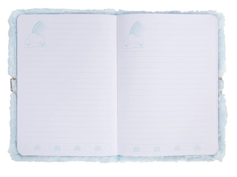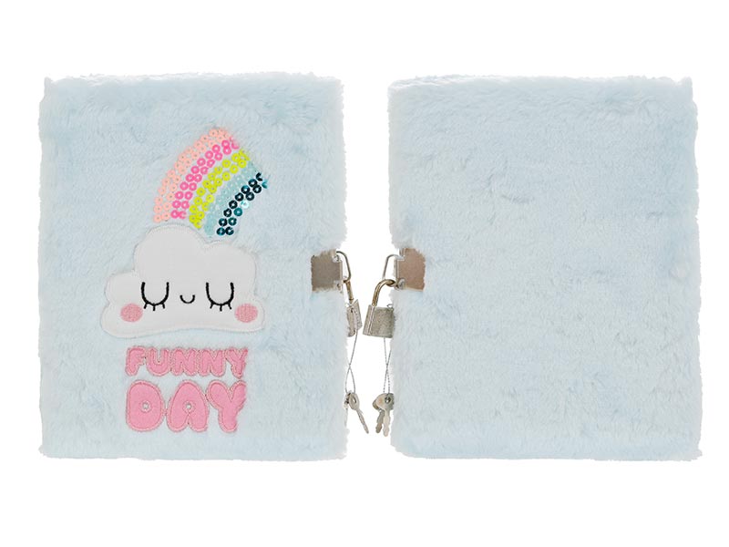 Exterior: cubierta suave de felpa azul claro con una nube de fieltro, un arcoíris de lentejuelas y mensaje “funny day”. Cierre con candado metálico en el centro lateral derecho.