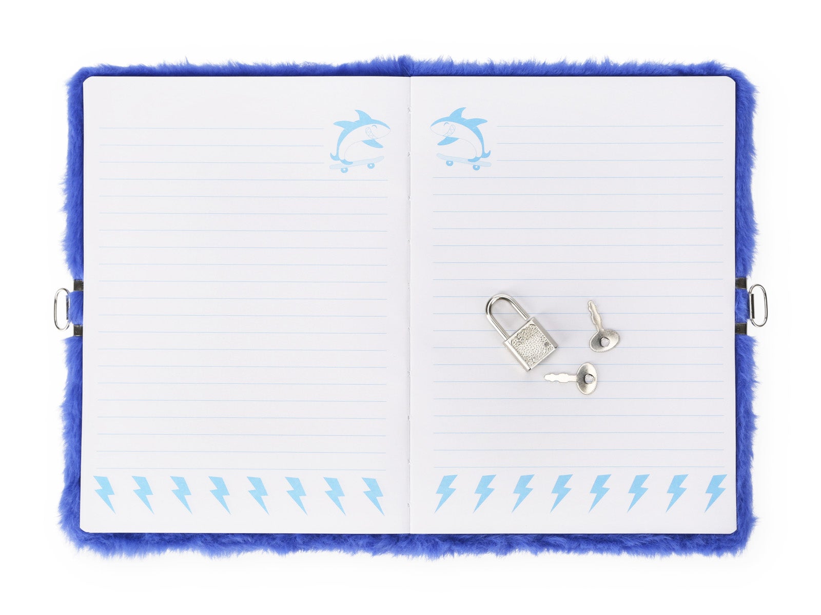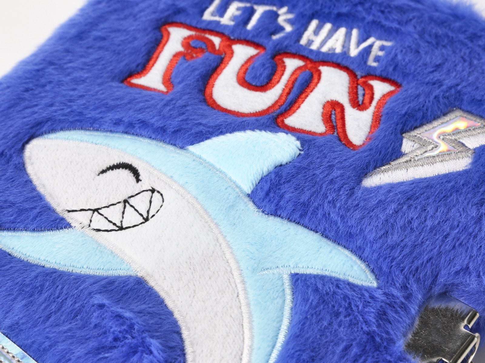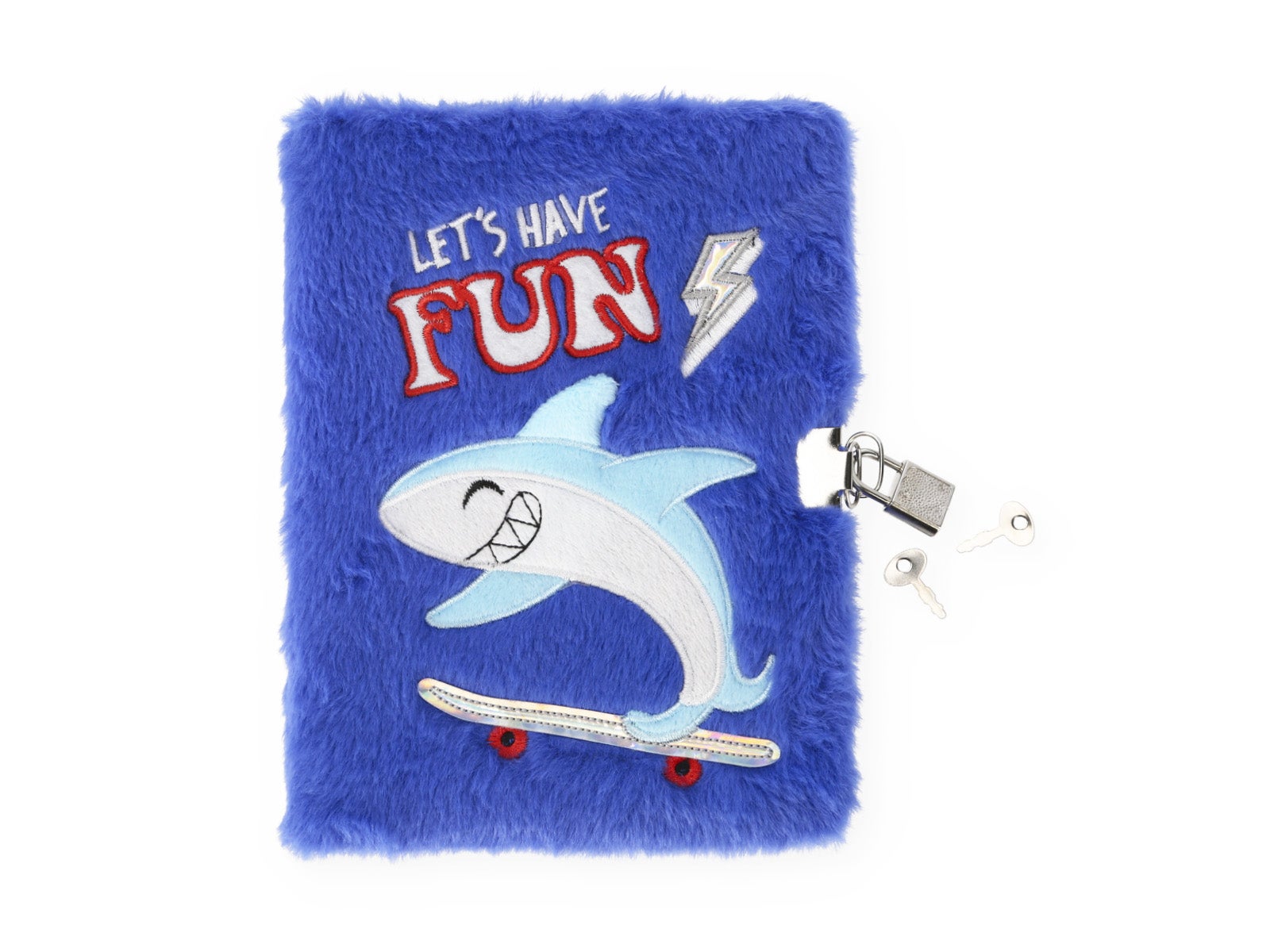 - Diseño: Portada peluda con un simpático tiburón en la cubierta, acompañado de un candado para que nada escape de tus páginas personales.