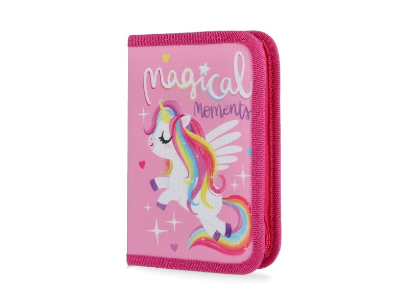 Diseño: color fucisa. Tiene una ilustración de un unicornio y la frase ‘magical moments’.