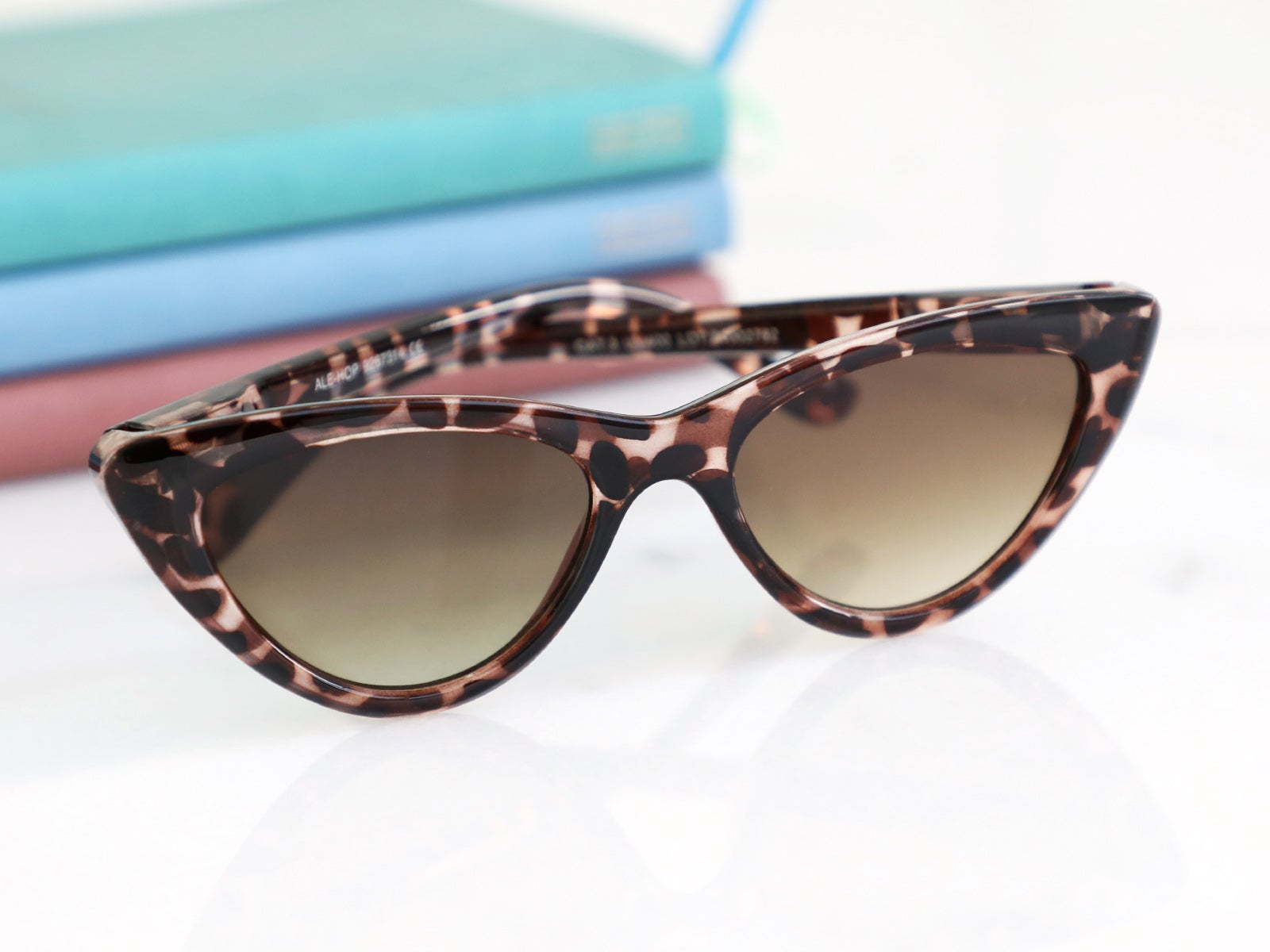 Diseño: gafas con forma de ojo de gato y montura de pasta con estampado animal en tonos marrones.