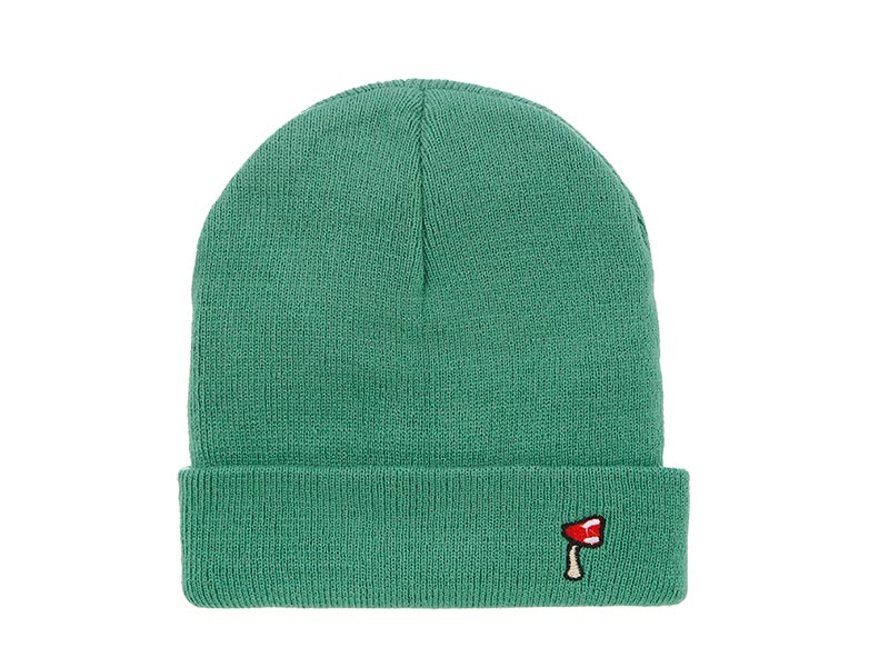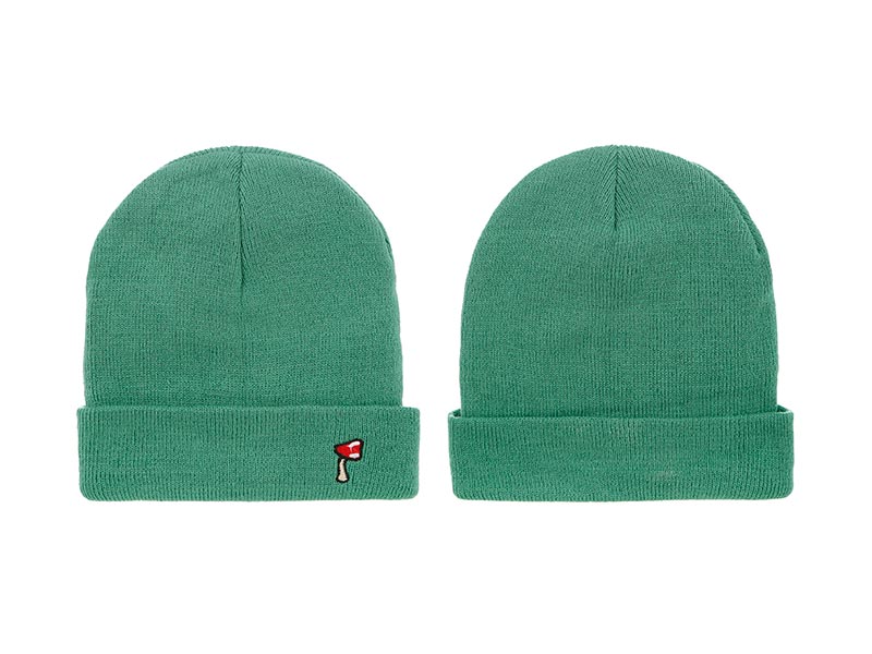 Diseño: gorro de color verde para mantener el calor en invierno con un dibujo de una seta.