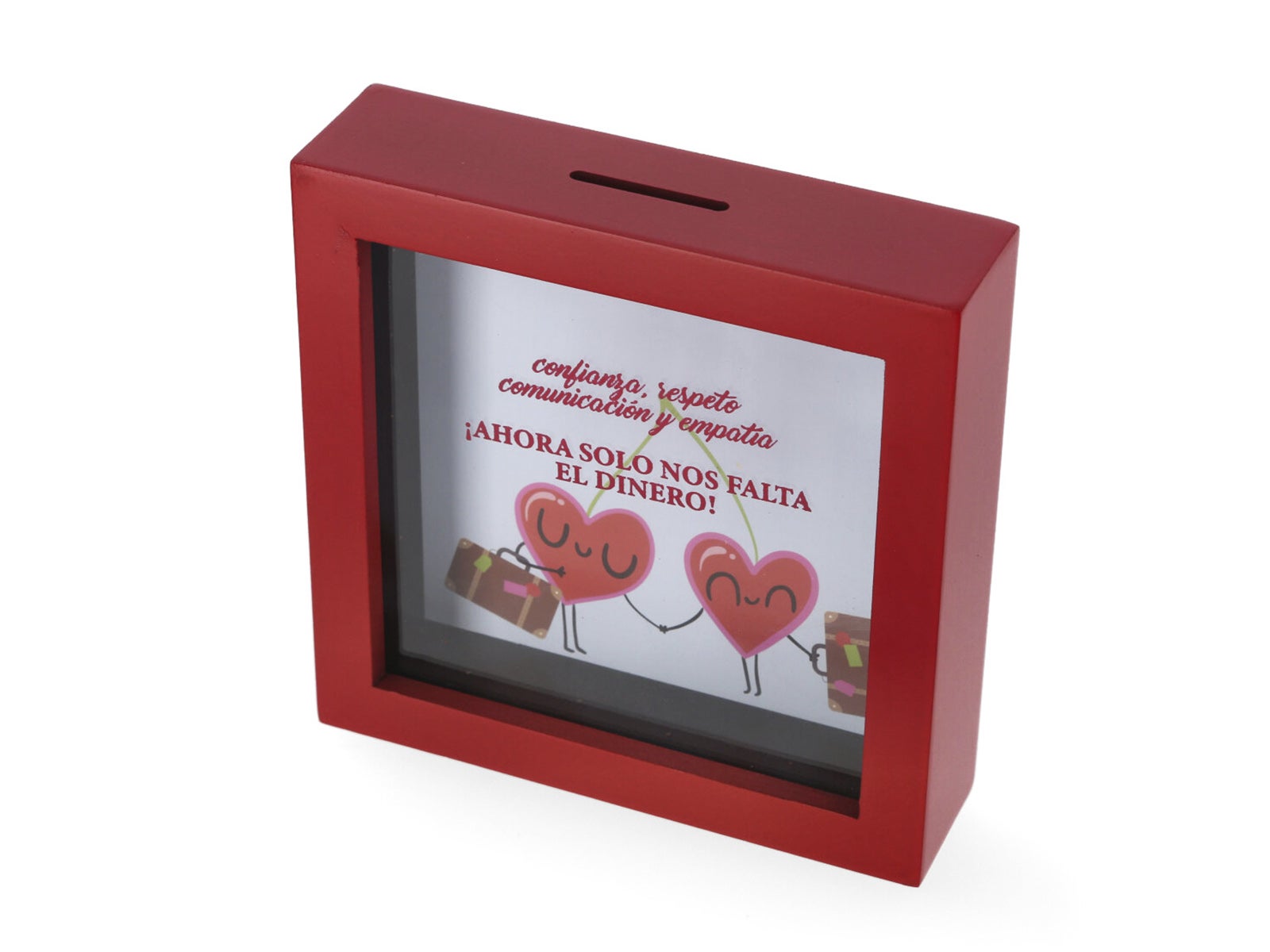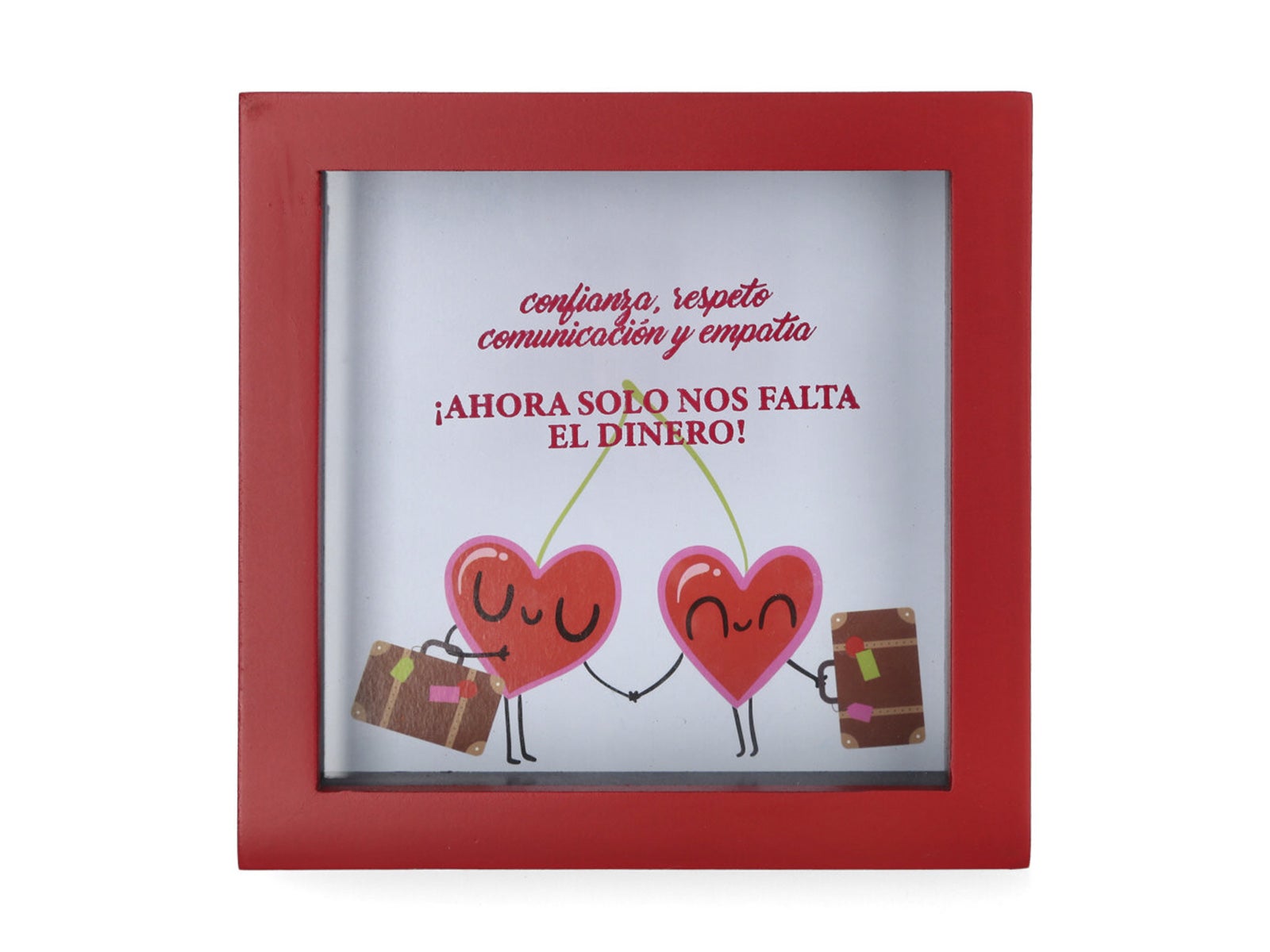 La Hucha de madera con corazones - ¡AHORA SOLO NOS FALTA EL DINERO! es perfecta para aquellos que saben que lo importante es viajar acompañados de confianza y respeto. Con un diseño lúdico y cariñoso, esta hucha se convertirá en la cómplice ideal de tus ahorros.