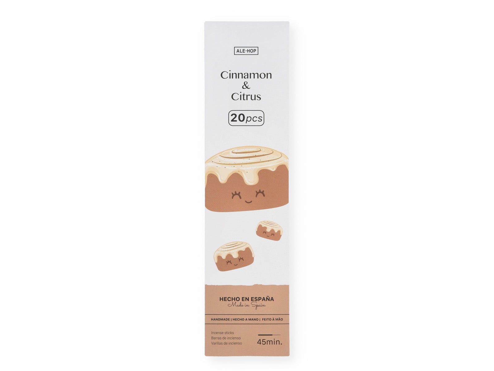 - Presentación: El diseño sencillo y elegante no dejará a nadie indiferente. Las varillas de incienso se presentan en un embalaje de fondo blanco con detalles en marrón y negro, con una vistosa ilustración de un rollo de canela espolvoreado con azúcar.