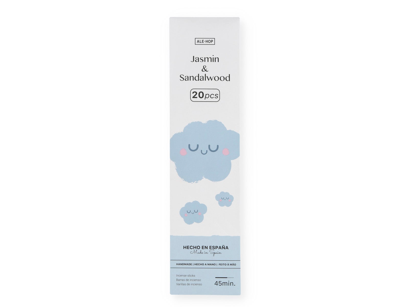 Despierta tus sentidos con el hipnótico Incienso Aromático Jazmín & Sándalo de ALE-HOP. Una mezcla de jazmín y sándalo que envuelve en una atmósfera de relajación. Su paquete con diseño de nubes sonrientes ilumina tus momentos zen.