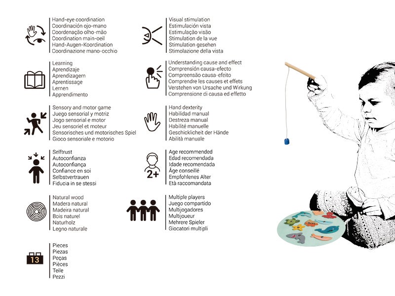 Diseño: círculo de madera color azul con diferentes peces con imán para que el peque vaya pescando cada uno con la ayuda de las dos cañas de madera que imantarán con cada una de las piezas.